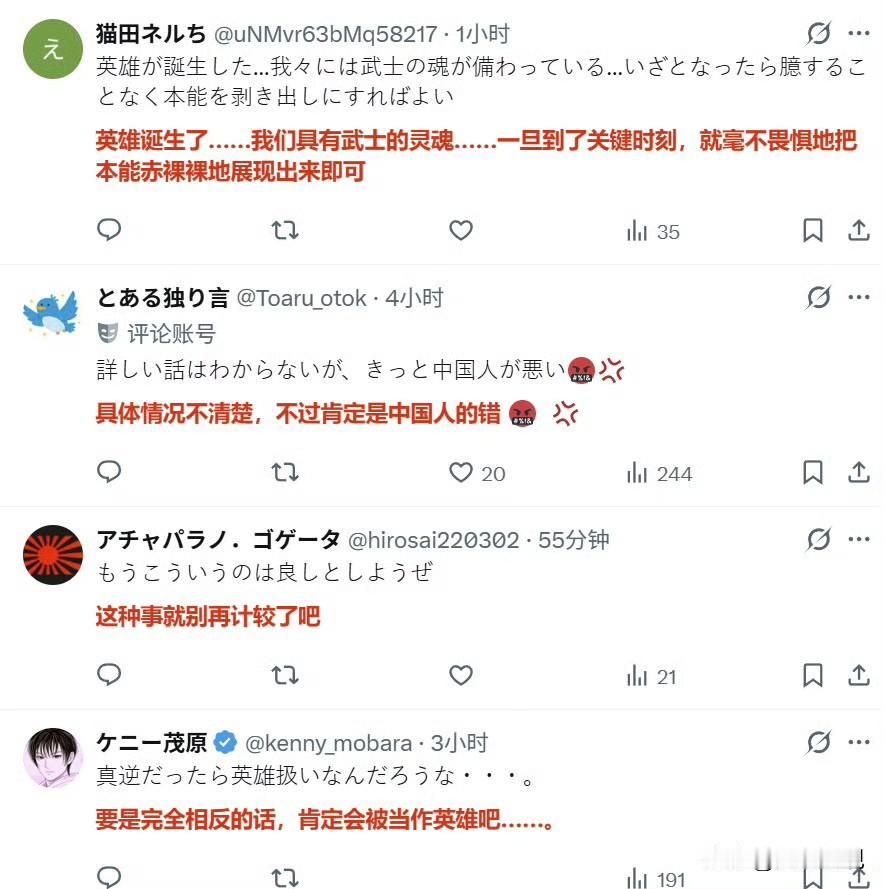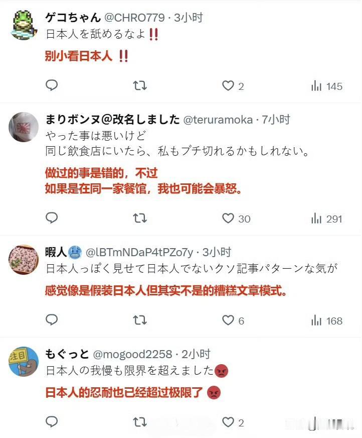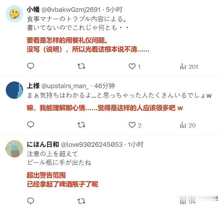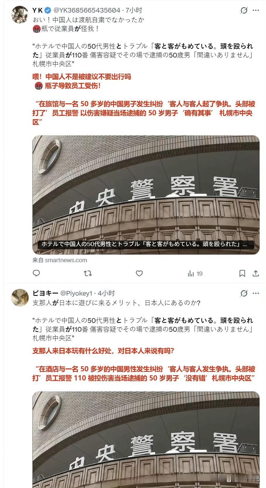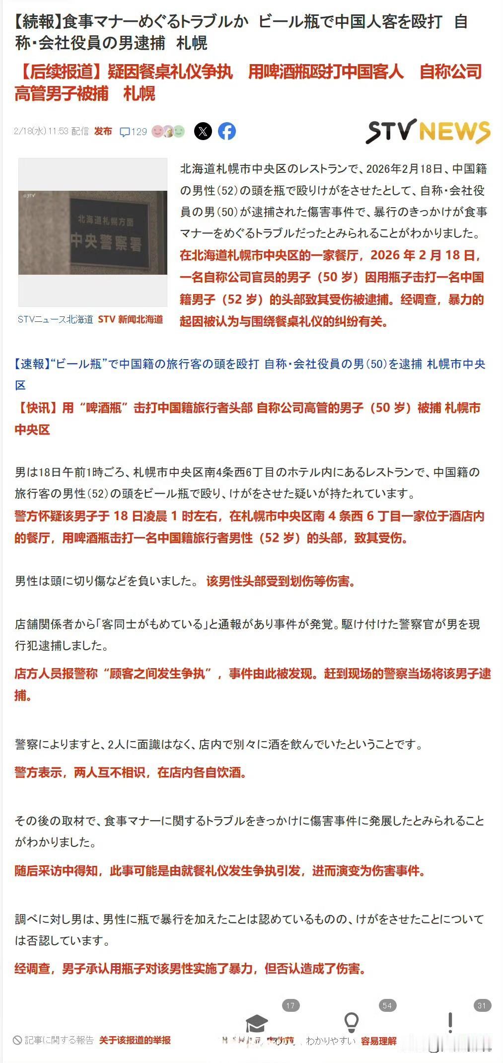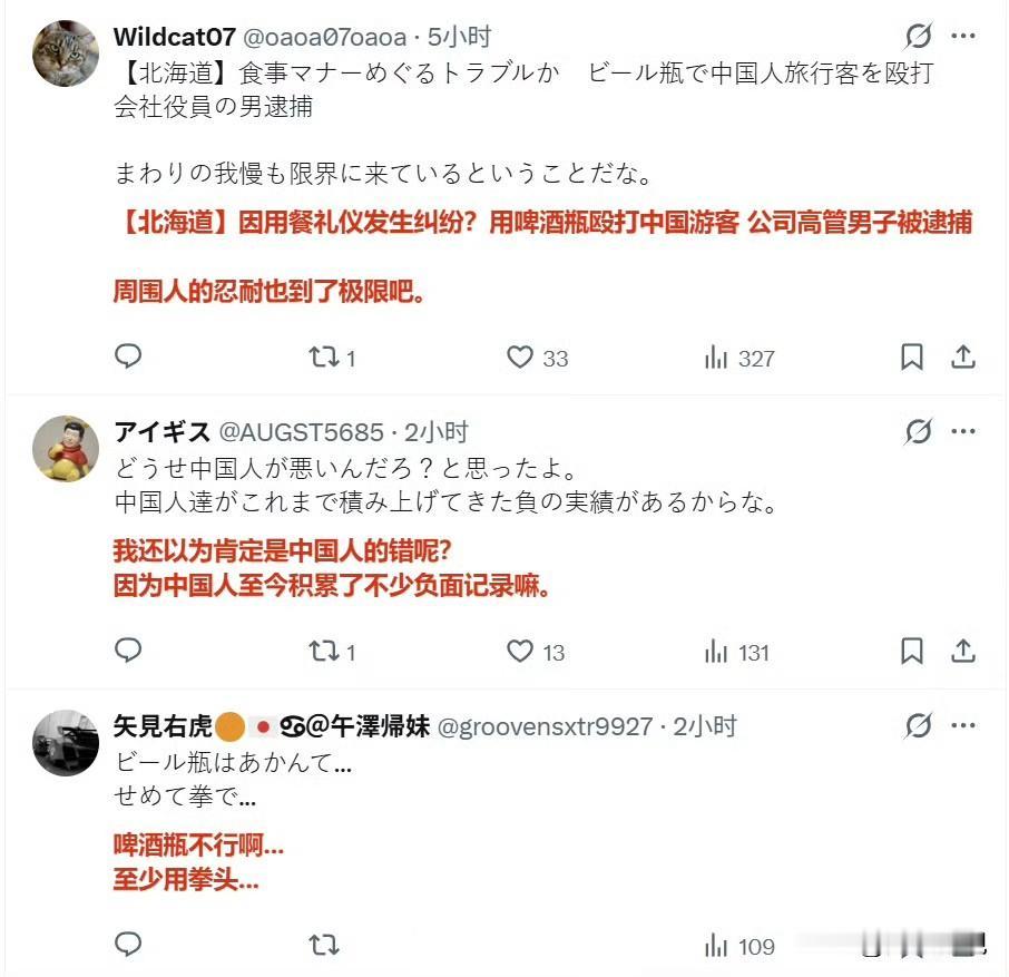 中国游客在日本被啤酒瓶爆头,看日本网民的反应,一名50岁的香港游客因为没有遵从日本的“餐桌礼仪”而被一名日本男子用啤酒瓶爆头,事后日本网民纷纷指责中国男子,认为肯定是中国人的错,并表示打人的男子是“英雄”,彰显了武士道精神,还有人说既然能出手打人,说明对中国游客的忍耐已经到了极限。春节前国家专门提示,因安全环境恶化,建议尽量不要去日本旅游,有些人非不听劝,大过年的跑去被爆头,何苦呢?去送钱还被人歧视嫌弃,也确实窝囊。