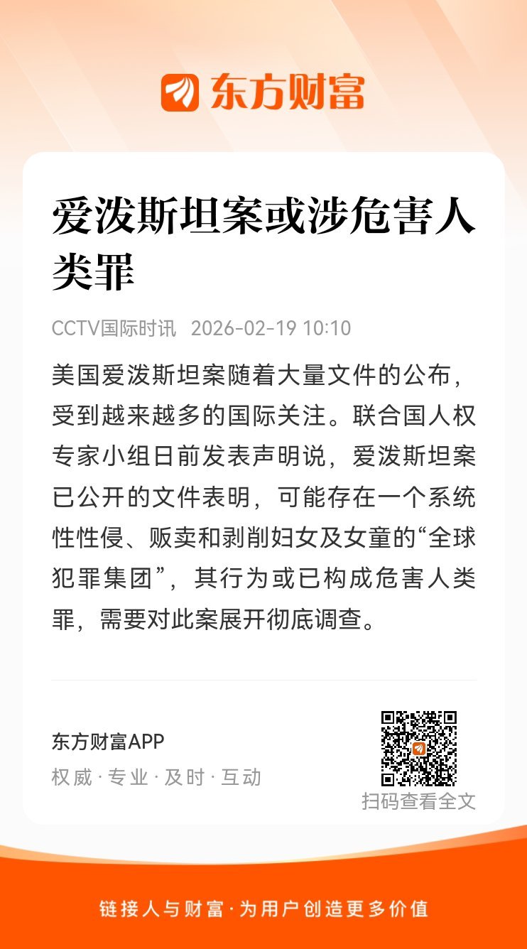 东方财富股票【爱泼斯坦案或涉危害人类罪】美国爱泼斯坦案随着大量文件的公布,受到越来越多的国际关注。联合国人权专家小组日前发表声明说,爱泼斯坦案已公开的文件表明,可能存在一个系统性性侵、贩卖和剥削妇女及女童的“全球犯罪集团”,其行为或已构成危害人类罪,需要对此案展开彻底调查。网页链接 (来自