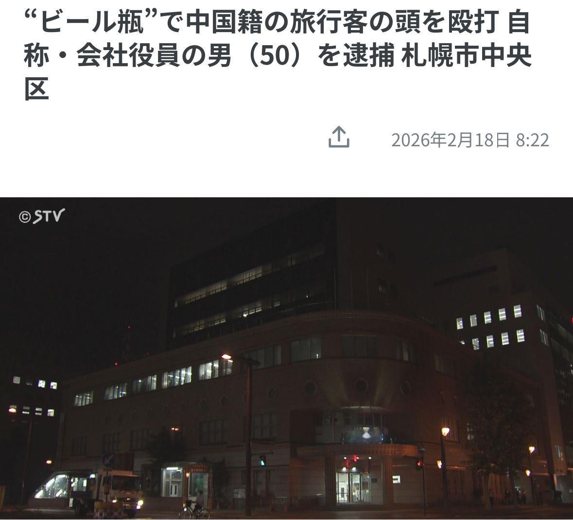 中国男子日本旅行北海道餐厅被打。 2026年2月18日,在北海道札幌市中央区的一家餐厅一名自称公司高管的男子(50岁)因用瓶子击打一名中国籍男子(52岁)头部致其受伤而被逮捕。据悉,冲突的起因疑似与用餐礼仪有关。 该男子于18日凌晨1时左右,在位于札幌市中央区南4条西6丁目的一家酒店内餐厅内,用啤酒瓶击打一名中国籍游客(52岁)的头部,涉嫌致其受伤。受害男子头部被划伤等。 店方相关人员报警称“顾客之间发生争执”,事件由此曝光。赶到现场的警察当场将该男子以现行犯逮捕。 警方表示,两人此前并不相识,当时分别在店内饮酒。事后采访得知,双方因用餐礼仪问题发生纠纷,进而发展为伤害事件。 在调查中,该男子承认用瓶子对对方施暴,但否认自己造成对方受伤。 ——这都啥世道?因觉得外国游客用餐礼仪不好就可以打人?!日本物价上涨普通民众日子不好过,社会底层怨气很重。高市内阁又在一个劲煽动排外情绪,更是火上浇油,最近日本治安越来越差。因不小心说错一句话或啥礼仪不对可能会挨打,大家暂时还是避开到日本玩吧!