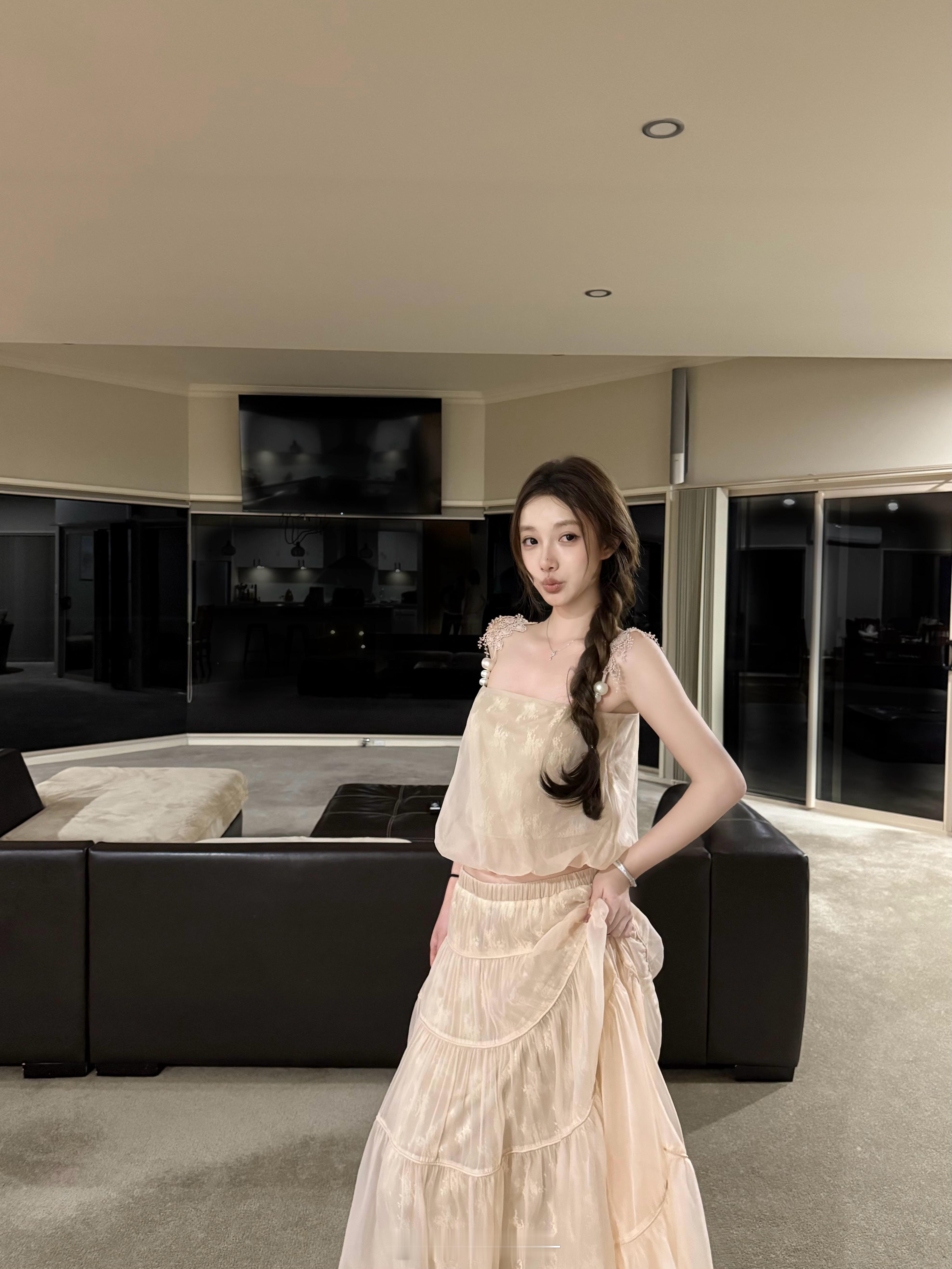 板栗可可Bankelili2/26/20:00🍃本期蕞蕞重工的一套!!rose同款!这套肉眼可见的细腻光泽贵气又高及!!整套采用了双层的面料 非常重工高级👍🏻上身不会有扎的感觉☁️又带着点朦胧感 行走间若隐若现的肤感吊带日常穿也不容易勒肩 舒适度还hin高!!👍🏻🍎揪2️⃣100⭕️⭕️~