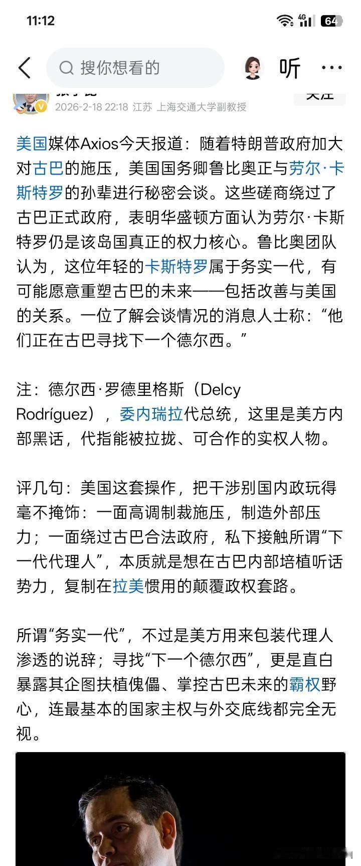 保垒最怕进入内部! 网络上有消息称,美国国务卿卢比奥现在绕过古巴政府,正与古巴前领导人、现在仍然可能掌握大权的劳尔·卡斯特罗的孙子进行秘密谈判,也就是说,美国正在古巴寻找另一个“德尔西”(委内瑞拉前副总统、现代理总统)。 这好像预示,美国仍然是致力于用比较文的、简单的手段,解决与古巴的尖锐矛盾。这说明,美国使用特种部队突袭委内瑞拉,几乎是不费吹灰之力,就轻而易举的非法控制总统马杜罗并带往美国的成功经验,让美国政府大喜过望,印象深刻,甚至是念念不忘。 擒贼先擒王,本来就是一个流传很久的计策。在美国政府看来,古巴无疑可能就是他们的眼中钉,肉中刺。美国在委内瑞拉出乎意料之外的成功,似乎大大增加了美国对古巴高层进行分化、拉拢利诱的关注程度。