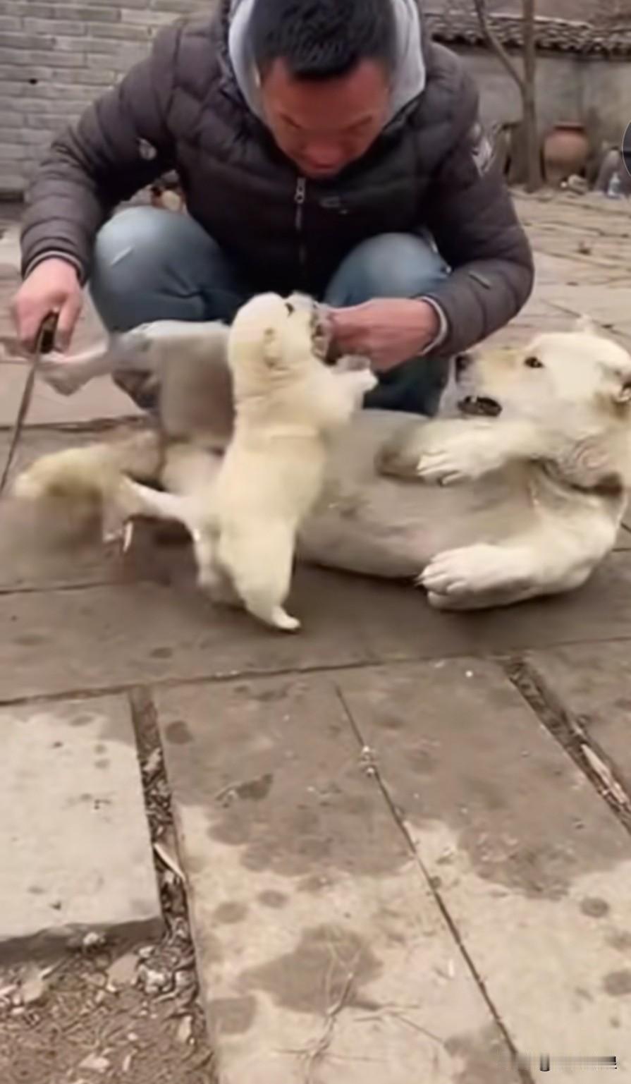 今天去朋友家做客,主人打算把刚生完小狗崽的狗妈妈杀掉吃狗肉,只打算留下一只小奶狗。主人把狗妈妈按倒在地,手持尖刀正要动手,没想到小奶狗护着妈妈,一口咬破了主人的手指,救了妈妈一命。狗妈妈和孩子