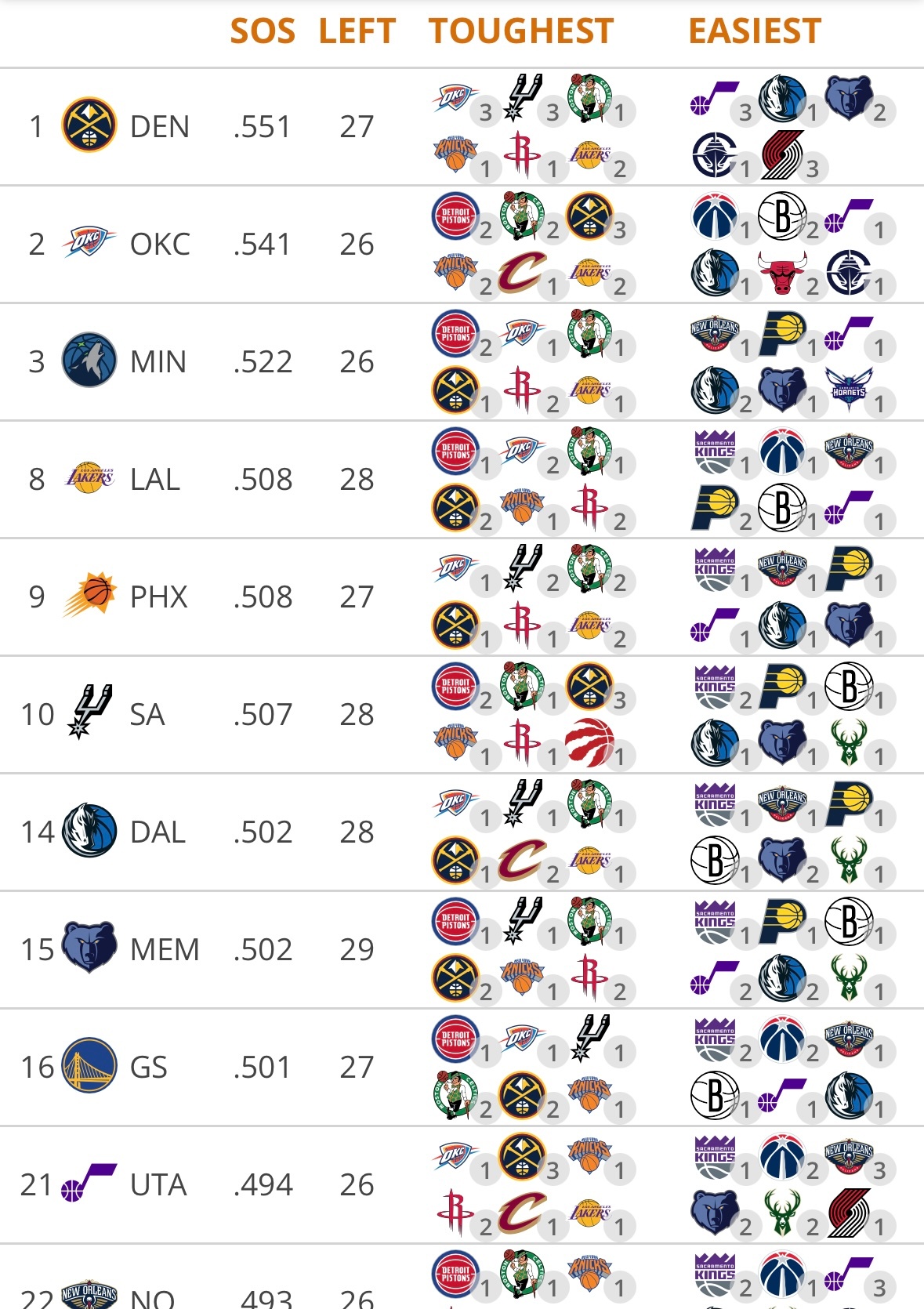 剩余最难对手:活塞(1场)、雷霆(2场)、凯尔特人(1场)、掘金(2场)、尼克斯( 1场)、火箭(2场)。