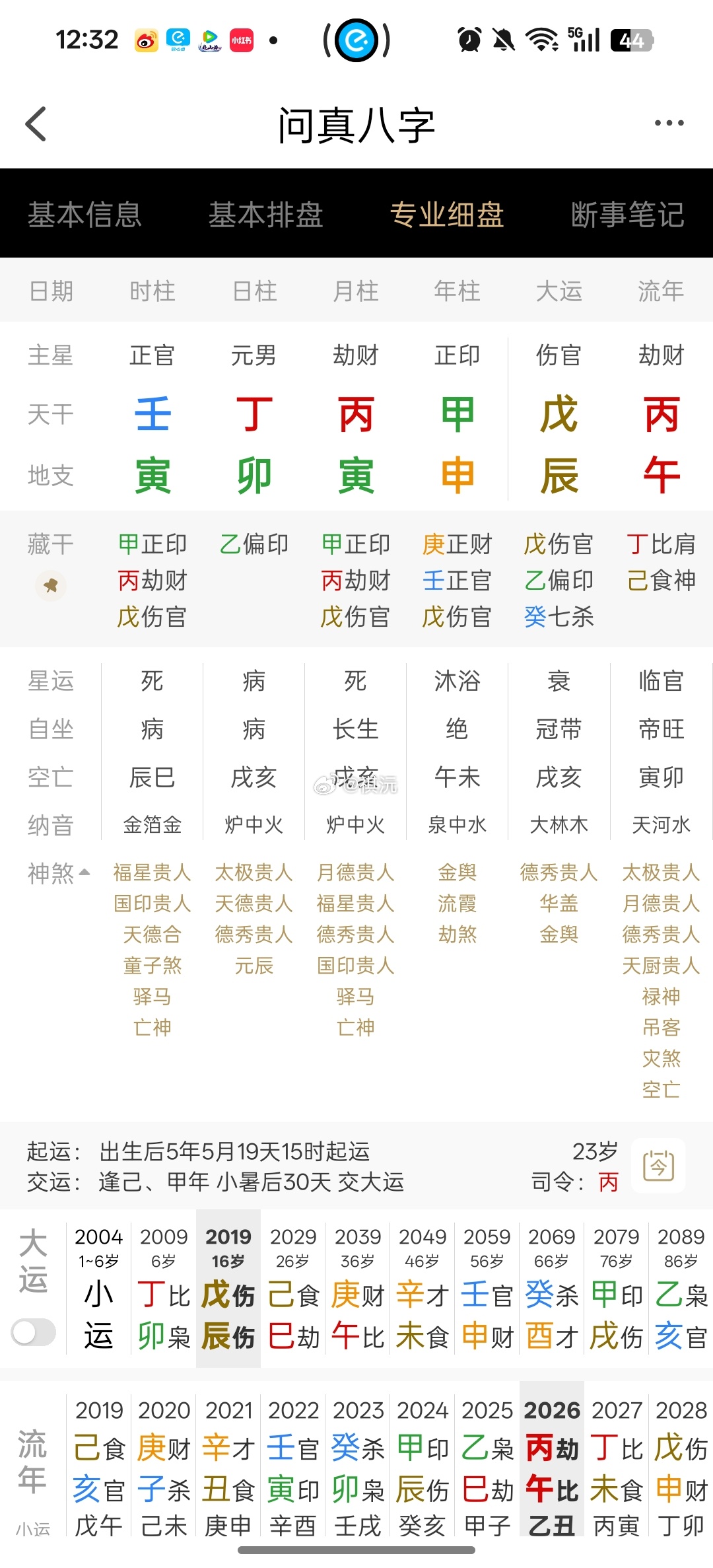 同样是大劫财在月令透干,丙火劫财,对于丁火日主,肯定是不喜的。但是鉴于他在丙午流年都可以一举夺冠(很多这种人,在这样大劫财透干强势的年份,不是旺自己的火,而是自己一辈子老二、受他人压制、被对比、被比较,被喘不过气。),他在这样的年份,有金牌🏅。那么估计他的时辰,肯定有制劫财、克丙的东西。