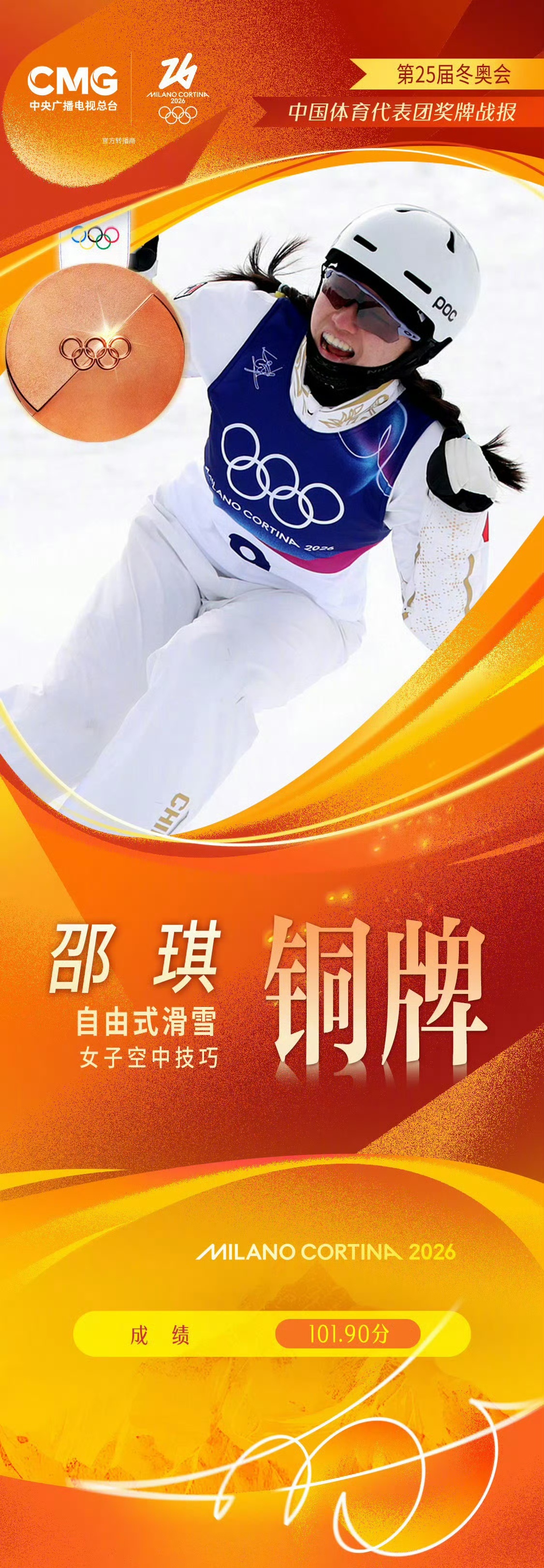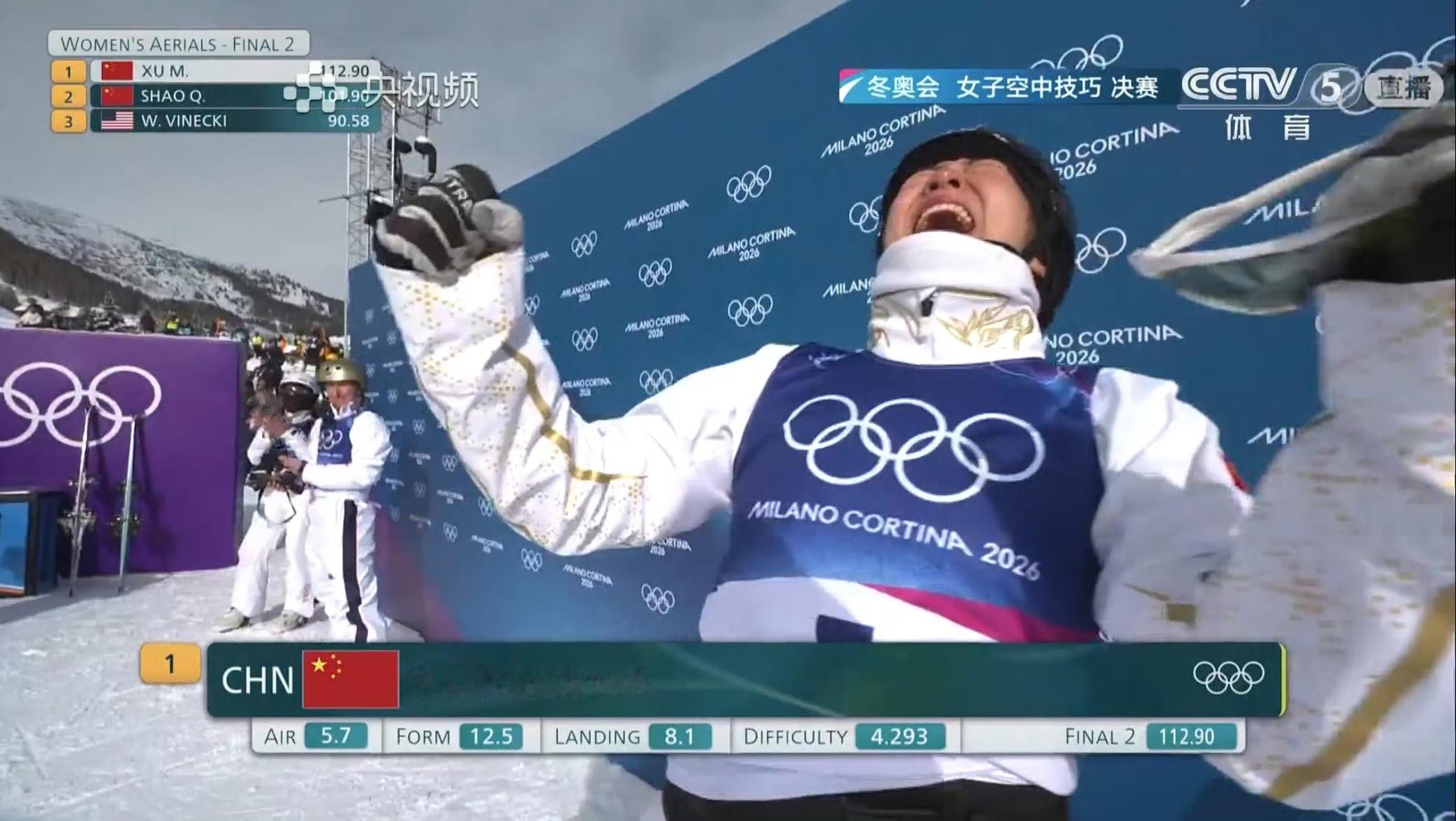 奖牌轮决战中,邵琪率先登场,以高质量动作拿下101.90分,为中国队稳住局面。压轴出场的徐梦桃挑战高难度动作,腾空高度达11.2米,落地稳健一气呵成,斩获112.90分,超越北京冬奥会夺冠成绩,锁定冠军。