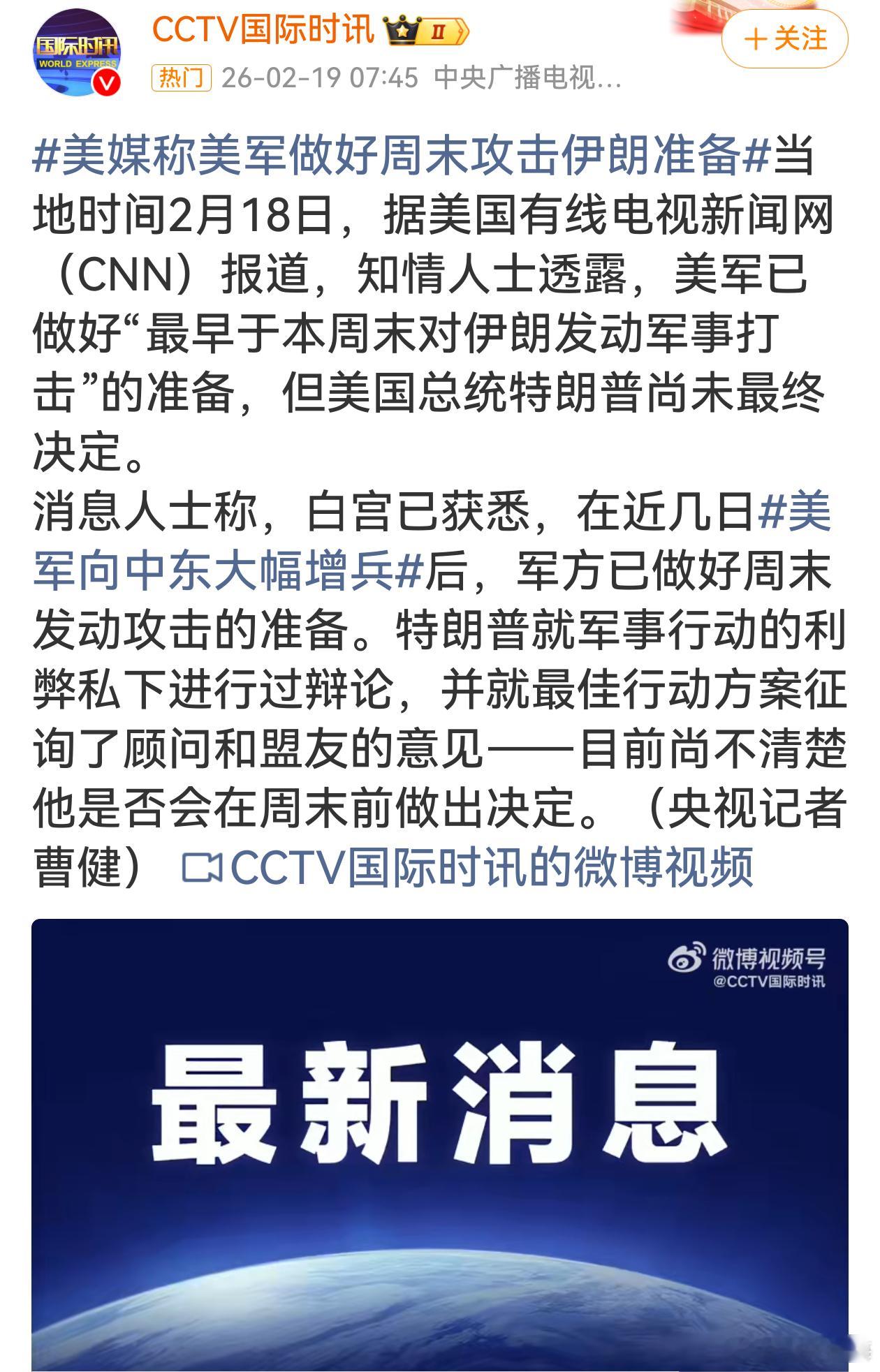 美对伊打击时间表正在缩短美媒爆料美军准备周末攻伊朗,这一紧张态势无疑加剧地区动荡。特朗普未最终决定,却已增兵且内部辩论行动利弊。美国好战本性尽显,其军事举动不仅威胁伊朗安全,更可能引发地区大战,打乱和平稳定,应受到国际社会严厉谴责与制约。