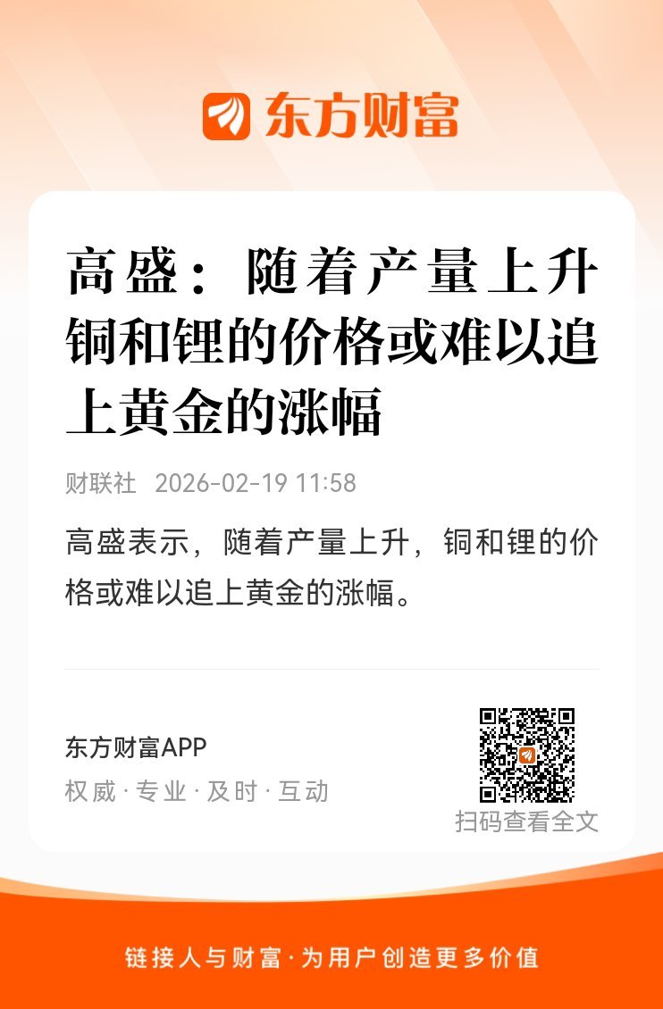 东方财富股票【高盛:随着产量上升 铜和锂的价格或难以追上黄金的涨幅】高盛表示,随着产量上升,铜和锂的价格或难以追上黄金的涨幅。网页链接 (来自