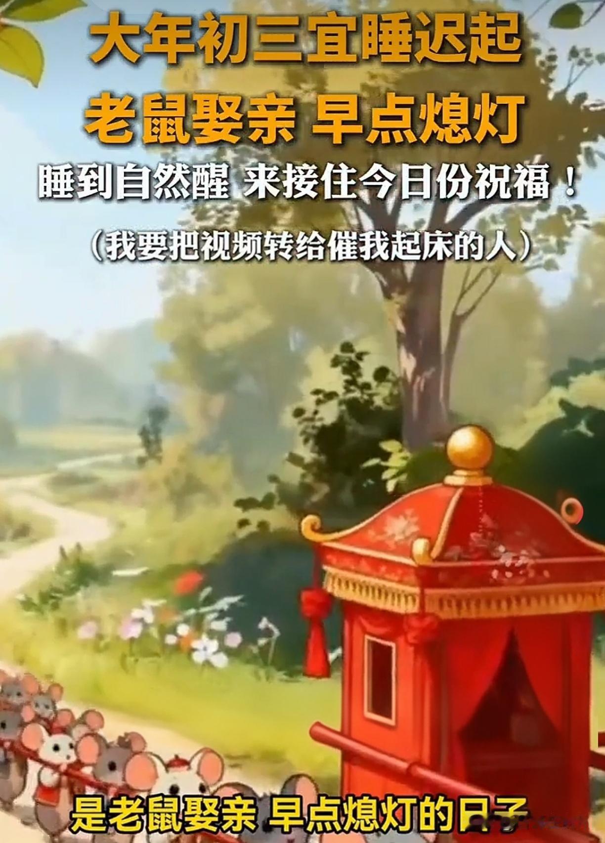 大年初三睡懒觉,居然是老祖宗留下的“正义”? 大年初三,你是不是现在还躺在被窝里不想动?千万别有负罪感!今天你要是早起了,那才叫“不懂事”。老话说得好:“初一早,初二早,初三睡到饱。”今天睡懒觉,不叫懒,叫顺应天意,这是刻在我们中国人骨子里的“法定休息日”! 咱们回想一下,从除夕忙活到现在,年夜饭要张罗,初一要拜年,初二要回门,嗓子说哑了,腿也跑细了。要是这时候还有人喊你去聚会、去应酬,听我一句劝,能拒就拒了吧。 以前总觉得过年嘛,就得热热闹闹,哪怕累点也得把戏做足了。但现在我想通了,真正的年味,不是把自己折腾得筋疲力尽,而是把舒服留给自个儿。特别是今天初三,古人说是“赤狗日”,不宜外出,怕起争执。你细品,这哪是迷信?这简直是老祖宗看我们前几天太累了,故意编了个理由,让你理直气壮地推开无效社交,关掉闹钟,踏踏实实补个觉! 以前我也觉得,过年就得端着,得懂事,得面面俱到。可现在我觉得,最通透的活法,反而是先把自己伺候舒服了。就像那句话说的,从“为了他人看”的表演,回归到“为了自己过”的体验。 所以,别急着起床,把被子裹紧,把这几天缺的觉都补回来。哪怕睡到日上三竿,也没人会说你。只有把这口气歇过来了,把精神养足了,接下来的日子才有力气去奔赴。 我在这儿也借着初三“睡到饱”的好彩头,给你拜个年:哪怕世界兵荒马乱,愿你今晚也能安然入眠;哪怕平时琐事缠身,愿你大年初三,能睡个好觉。 今年初三,你是几点醒的?是被人从被窝里拽起来的,还是理直气壮地按下了“免打扰”模式?评论区晒出你今天的起床时间,看看谁是今天的“睡神”,谁又是那个“苦命早起的人”!👇 大年初三 睡懒觉 春节民俗 悦己式过年