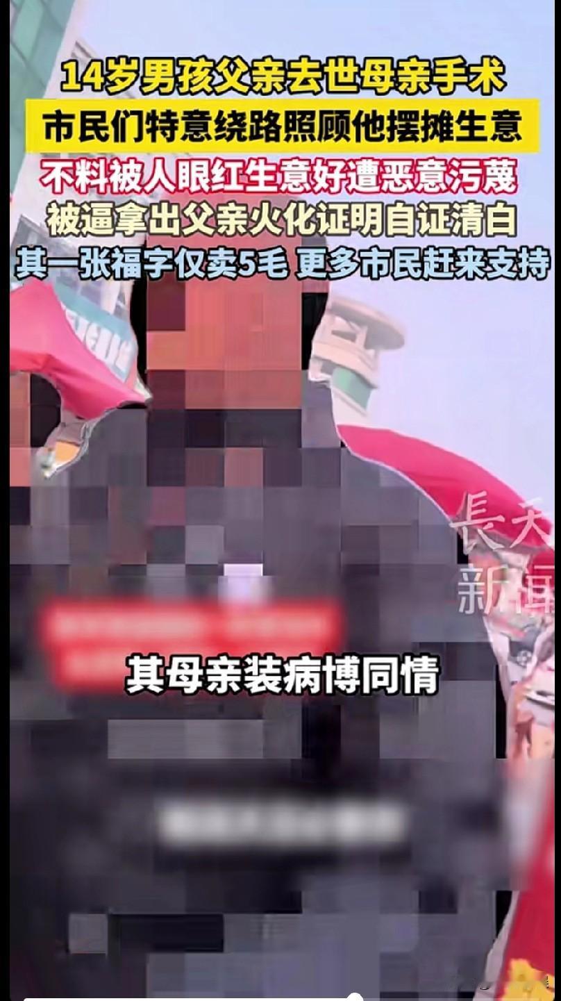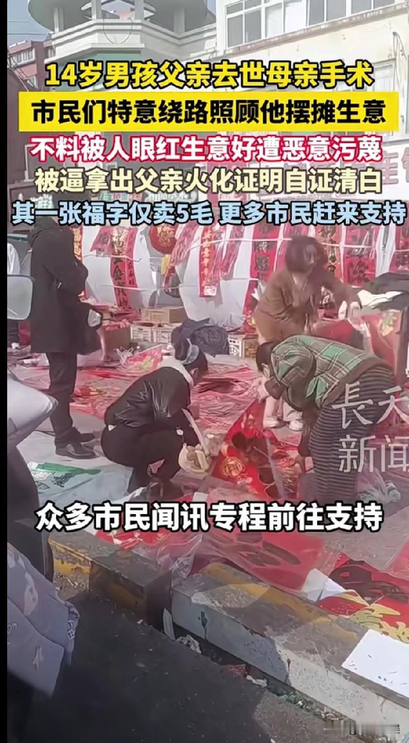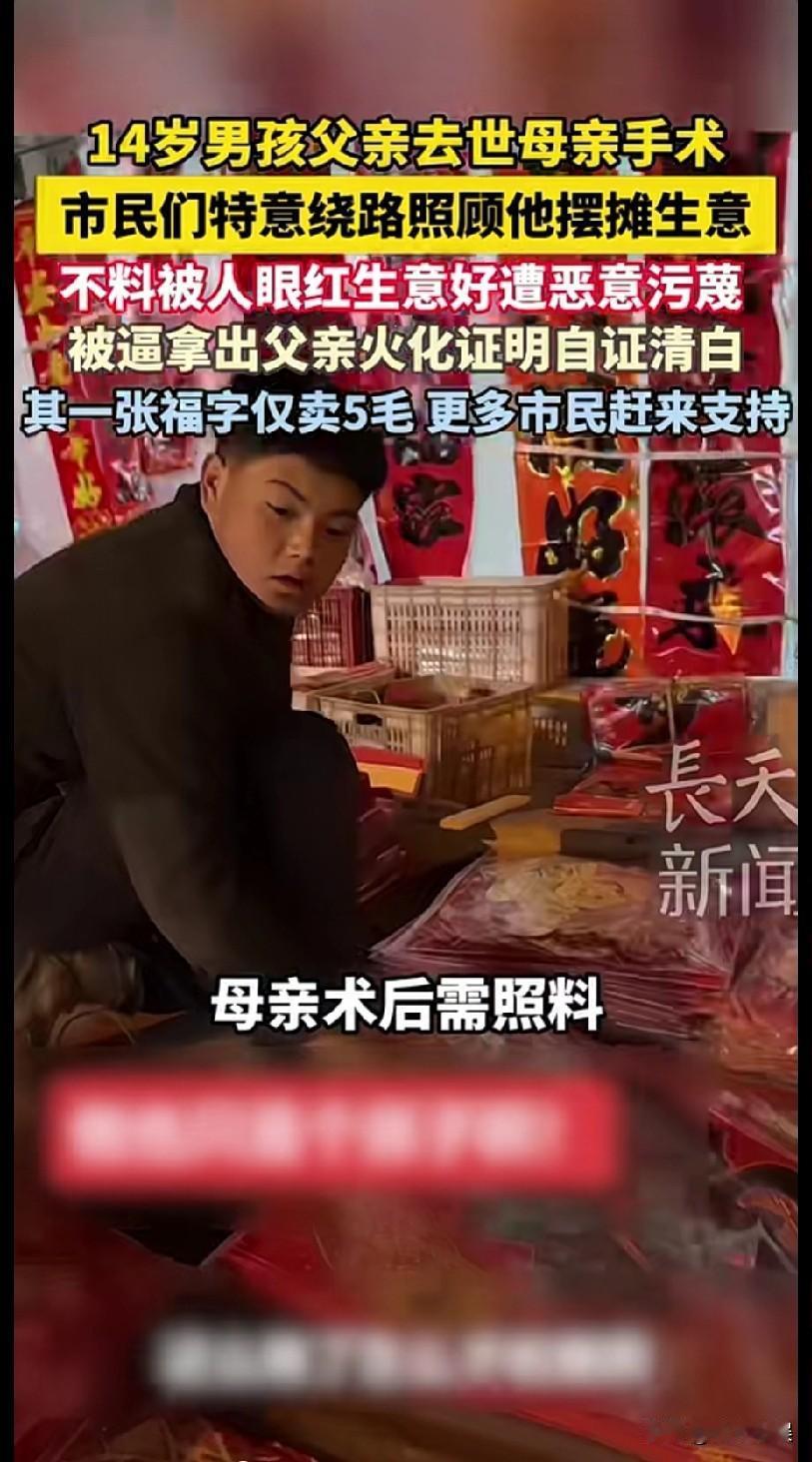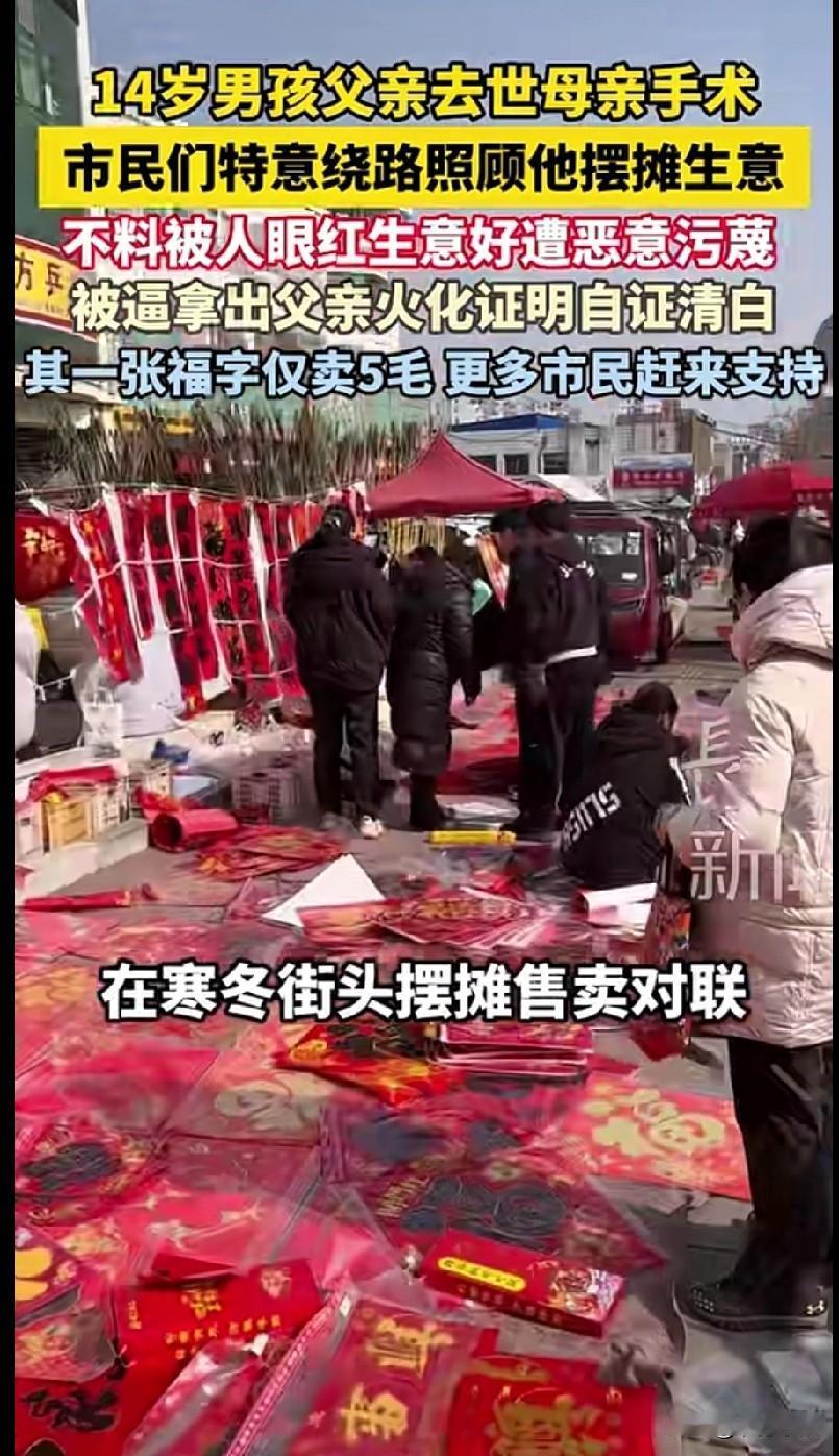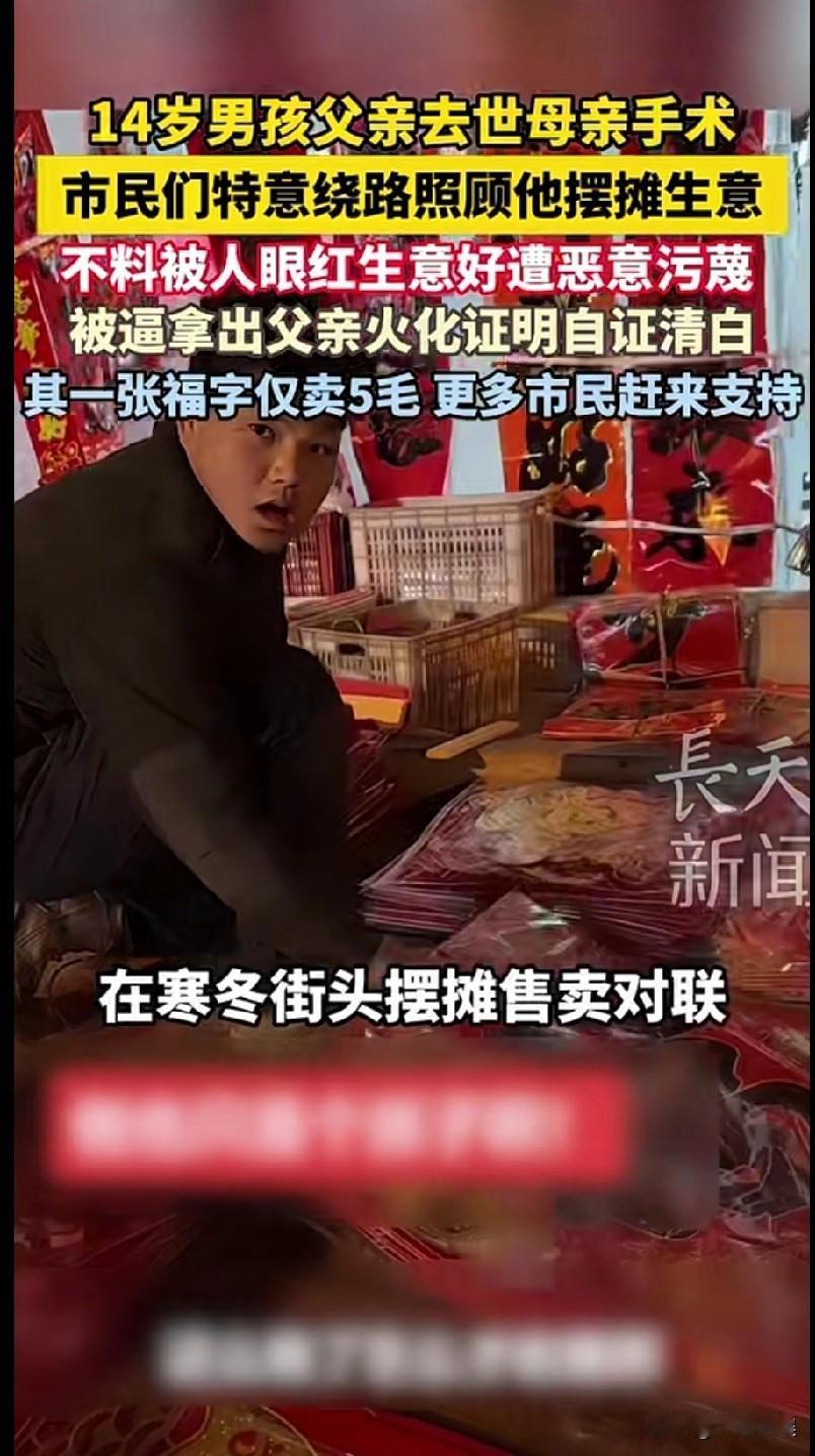 山东的一位14 岁少年,父亲2024 年因癌症去世,母亲刚做完大手术,无法劳作,家中还有 81 岁老人需要照顾。 为补贴家用,14 岁少年每天摆摊超 10 小时,卖 5 毛一张的对联、福字。但是摆摊期间,却遭到了邻近摊贩的质疑,质疑男孩是“卖惨博同情”、“母亲装病”,当众言语刁难男孩。 男孩没有哭闹争执,而是忍住痛苦,默默地拿出了父亲火化证明与母亲病历本,以最刺痛人心的方式自证清白。引发路人围观与愤怒,纷纷站出来帮助男孩。 事情曝光后,市民们特意绕路、排队购买对联,来支持孩子。同学们也自发赶来帮忙看摊、吆喝。爱心人士更是下单万元购买春联,但是男孩坚持等价交货,拒收无偿捐赠。也有人偷偷给男孩塞钱,男孩发现后一律退回,坚守靠自己双手挣钱,不接受捐赠。 摆摊13 天,少年共收入约3 万元。 少年的母亲发声说,她常常教育孩子:人穷志不穷,不劳而获的钱一分不收,要靠劳动撑起家、守尊严。 看完后,真的太心疼了这个男孩了。 14 岁的年纪,本该是安心读书,被家人好好呵护。然而他却失去了父亲,母亲又患病,男孩不得不在寒冬摆摊卖对联来挣钱补贴家用。 最让人难受的是,本来就很苦了,却还要被无端质疑刁难,被迫拿出父亲的火化证来自证清白,孩子心里该有多委屈、多崩溃。 好在还是好人多,让男孩感到人世间的温暖。