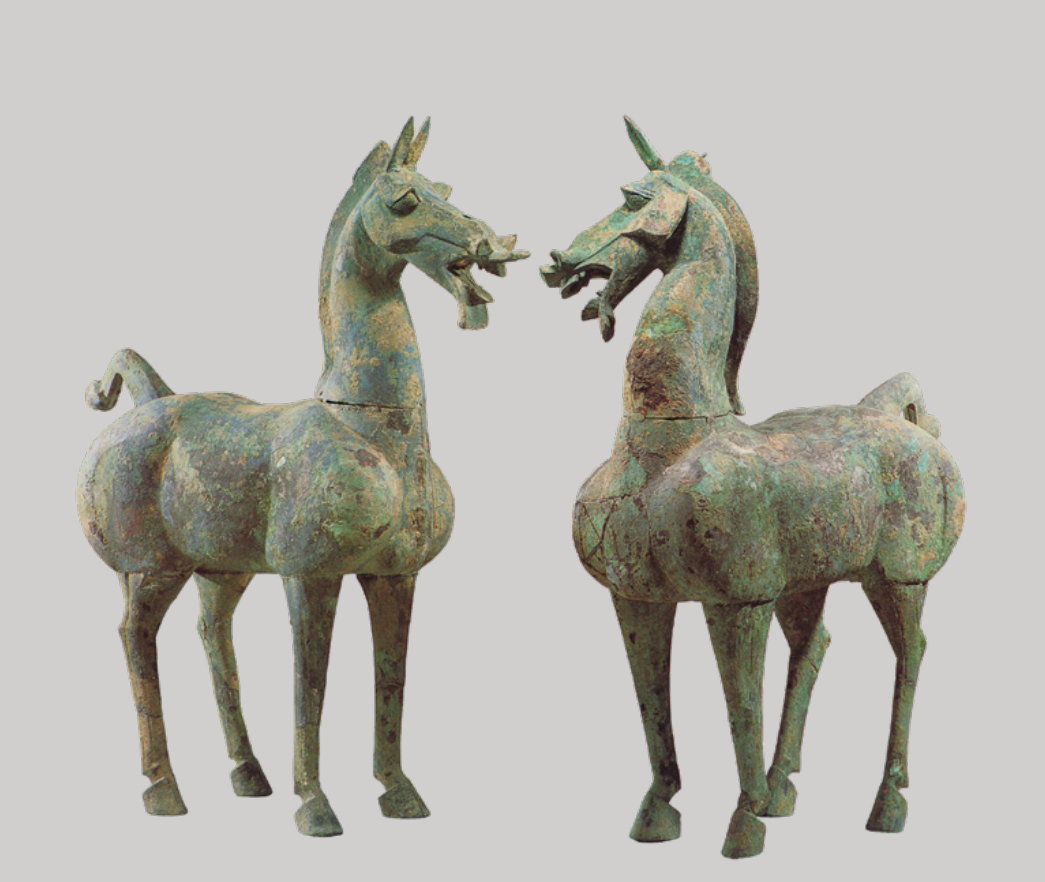 每天一件青铜器马年新年快乐 河北保定市博物馆藏1981年河北省徐水县方岭村2号墓出土两件东汉青铜马. 直颈马高116厘米、长70厘米,曲颈铜马通高113厘米、长66厘米,均重约51千克.