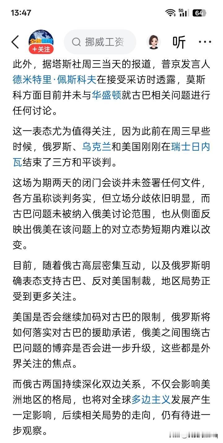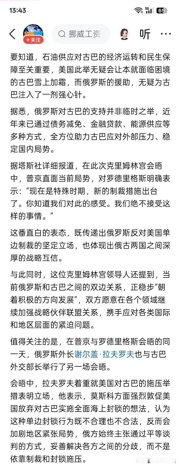 嘴上义愤填膺? 网络上的消息说,俄罗斯总统普京在克里姆林宫会见了古巴外交部长布鲁诺·罗德里格斯。 会见中,普京对古巴表示了支持,并且对美国总统特朗普对古巴的制裁和封锁,好像义愤填膺,声称不可接受,等等。 但是,消息介绍的虽然字数不少,但最终也没有看到什么具体实施的、切实可行,即刻进行的物质支持和援助行动。 古巴现在缺的主要是燃油,或者说炼油厂需要的石油,以及填饱肚子的食品,而不是嘴皮子。 不过,由于古巴特殊的地理位置,要想突破美国的各种制裁和封锁,获得有力、有效的支持和援助,也并不那么容易。