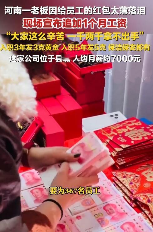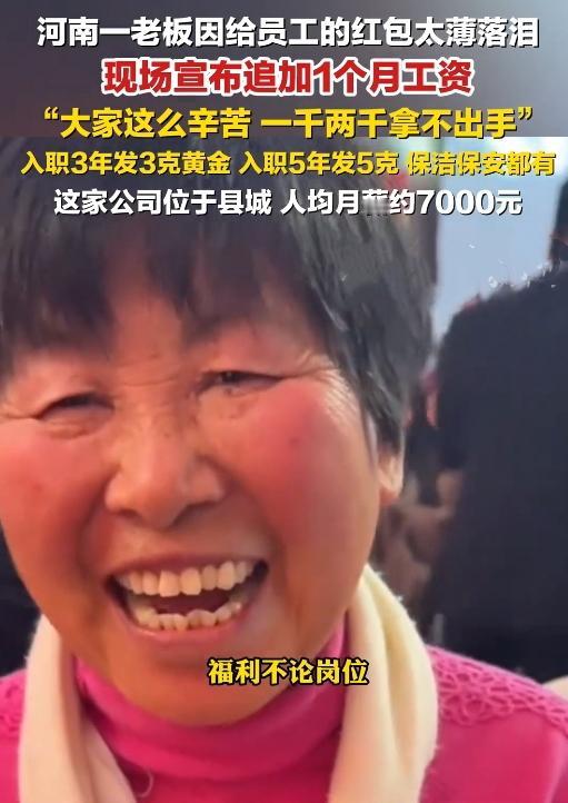 这波操作,破防了!老板发红包嫌太薄,当场掉泪还追加200万,这格局绝了! 河南濮阳的王继坤董事长,给367名员工发年终奖时,看着基层员工手里1000、2000块的红包,鼻子一酸红了眼:“今年大家拼了一整年,这钱拿不出手啊!” 当场拍板追加福利:红包少于月薪的,再发一个月工资!3500到1万不等,其中几人直接加1万,光这追加就掏了200万。要知道,这是四线城市的初创公司,人均月薪7000多,部分基层岗位平均超两万,本就不低了。 更实在的是,入职3年以上发3克黄金手串,5年以上发5克黄金挂坠,保洁、保安一个不落。王总说:“员工跟着我干,不能让他们寒心。” 都说人心换人心,老板把员工的辛苦刻在心里,员工自然愿意拼命往前冲。这样的企业,想不红火都难! 你被这位老板暖到了吗?评论区聊聊你遇到的暖心职场事,点赞转发,让更多人看到这份双向奔赴的真诚。