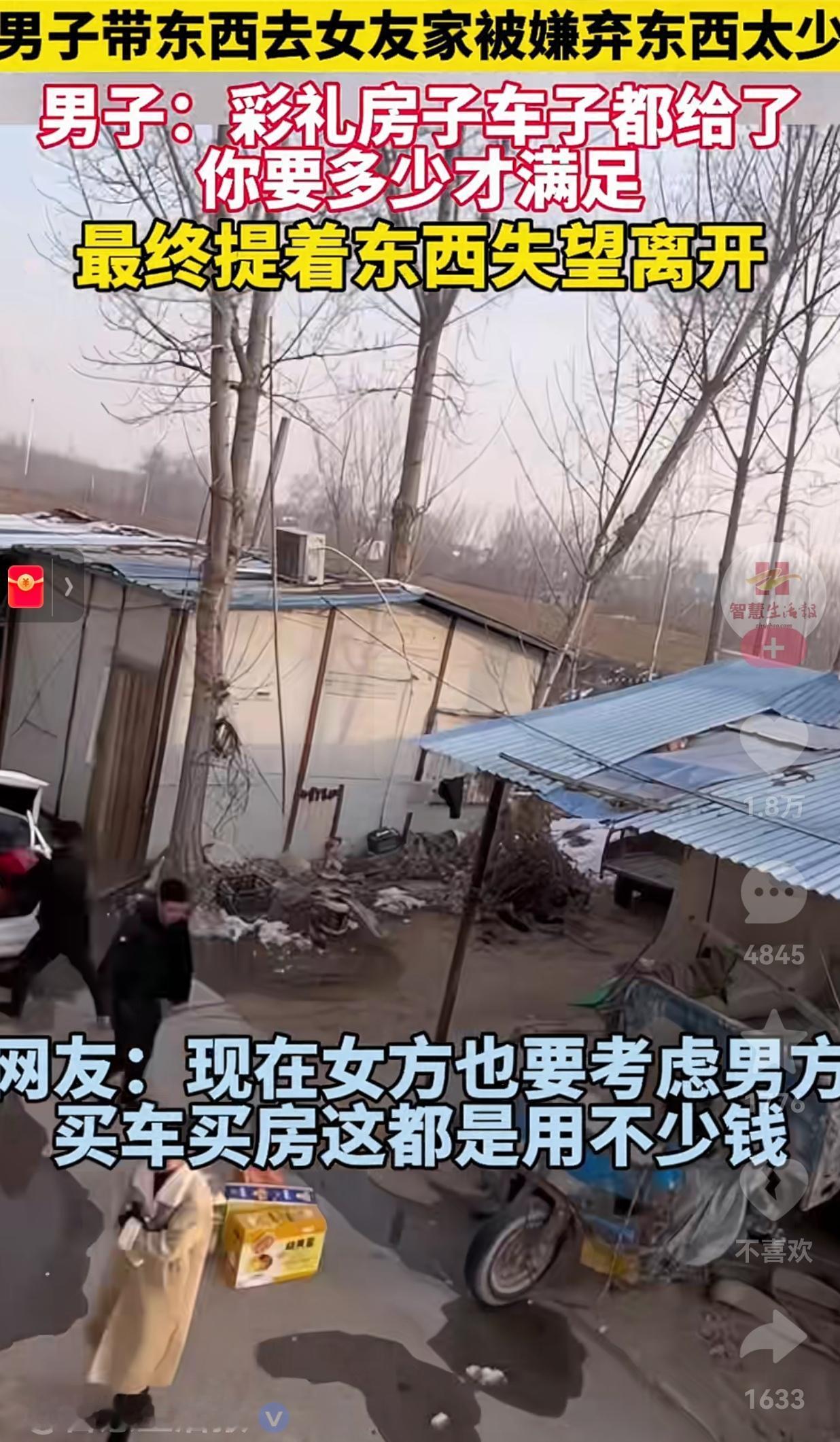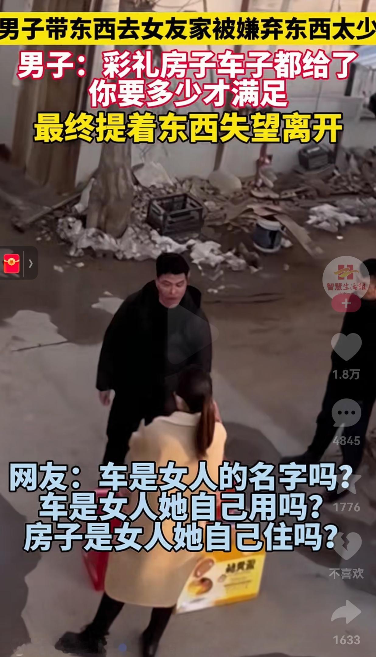 人要学会知足!不知足的人就会很痛苦!彩礼房车都给了,上门却被嫌礼少,网友:这婚,不结也罢。 一个大男人到女友家拜年,手里拎着礼品,站在女友家门口,脸涨得通红,对着女友和她家人吼:“彩礼、房子、车子我都给了,你到底要多少才满足?” 然后,他把东西一提,转身就走了,背影看着又硬又孤单。 男子已经按女方要求,给了彩礼,买了房和车,甚至可能都写在了女方名下。 这次上门,是结婚前的最后一次沟通,带的礼品不算寒酸,有酒有保健品,还有个大箱子。 可女方家人扫了一眼,脸就拉下来了,话里话外嫌“东西太少,不够排场”。 男子那句“你要多少才满足”,听着像气话,其实是无数男人在谈婚论嫁时的心声。 网友看到后评论说:“车是女人的名字吗?车是女人她自己用吗?房子是女人她自己住吗?” 这话太扎心了。很多时候,男方掏空家底买的房和车,名义上是给小两口的,实际上却成了女方拿捏男方的筹码。 还有人说:“从结婚那天以后的,才能算是夫妻共同财产,之前的所有,女人凭什么牵扯?” 这话虽然有点绝对,但道理没错。婚姻的基础是感情和信任,不是婚前的财产分割。如果一开始就把“你给我多少”挂在嘴边,那这婚,从根上就歪了。   其实,现在的婚恋市场,好像越来越像个菜市场。 男方的条件,被明码标价成了房、车、存款。 女方的价值,被换算成了年轻、漂亮、听话。 可我们忘了,婚姻最该看重的,是两个人能不能一起扛事儿,能不能在柴米油盐里互相体谅,能不能在对方落魄时,还能说一句“别怕,有我呢”。 那个提着东西离开的男人,虽然狼狈,但他守住了自己的底线。他没有在无底线的索取面前低头,而是选择了及时止损。 这不是输,这是清醒。  大家觉得呢?欢迎大家评论区讨论留言。