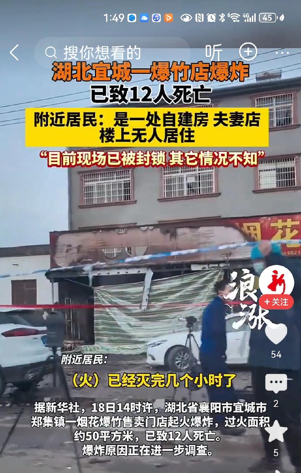 过火面积100余平方米 马年首例惨案! 2月18日,大年初二 湖北省宜城市郑集镇千和烟花爆竹专营店发生爆燃,过火面积100余平方米,造成12人死亡。 其中,7名成年人,5名未成年人。包括店主和11名顾客。 当举国同庆欢度新春佳节之时,一场爆燃事件,夺取了12条生命。可怜啊,年还没有过完[流泪][流泪][流泪] 12个鲜活的生命,永远定格在大年初二。十二个家庭,瞬间从过年的喜悦跌落到痛失亲人的悲痛之中。 不幸,有时候比明天来得更快! 试想一下,如果烟花爆竹禁燃令没有废除,也许这场人间悲剧就不会发生。 愿生者坚强,逝者安息,但愿通往天堂的路上没有爆燃!