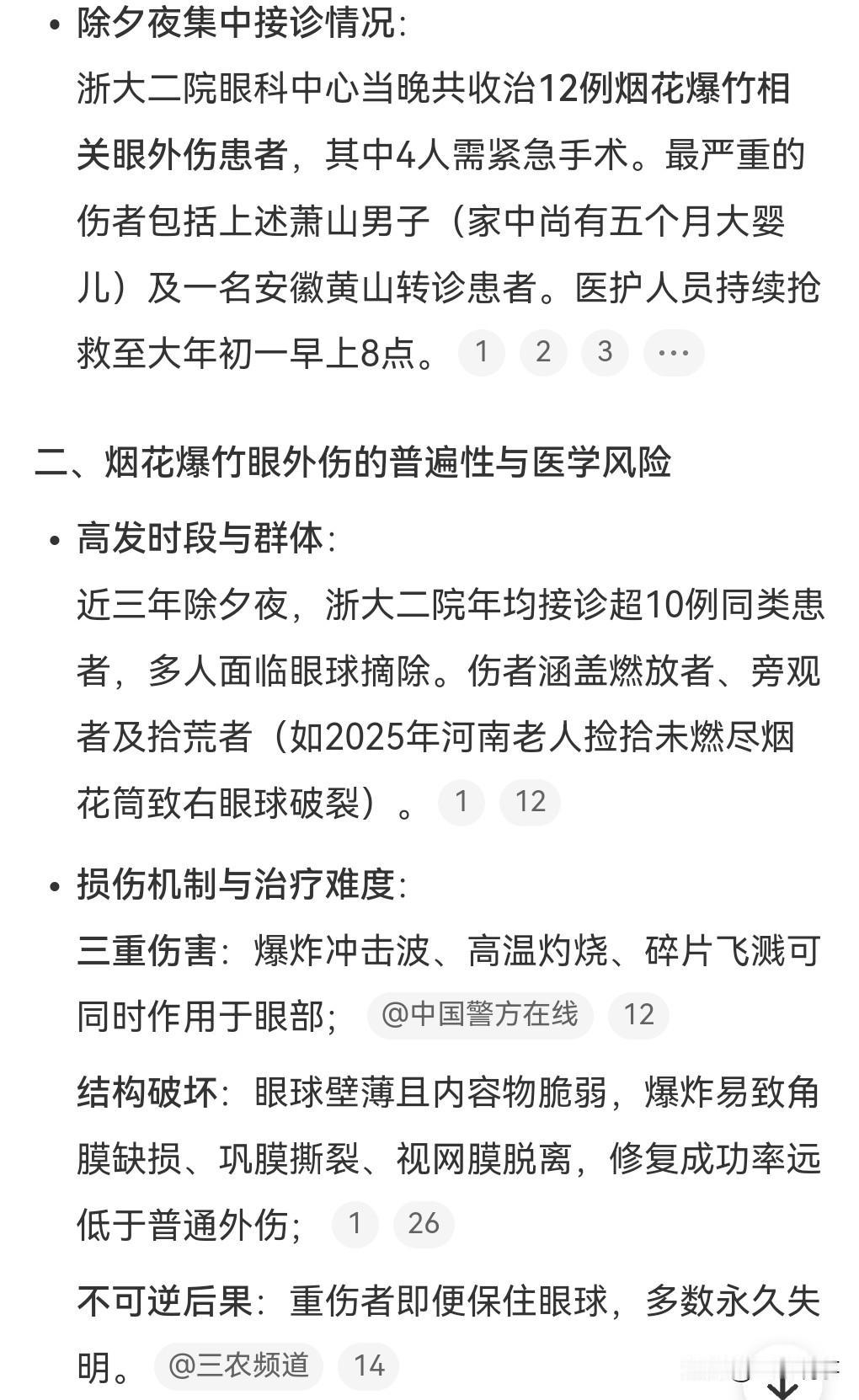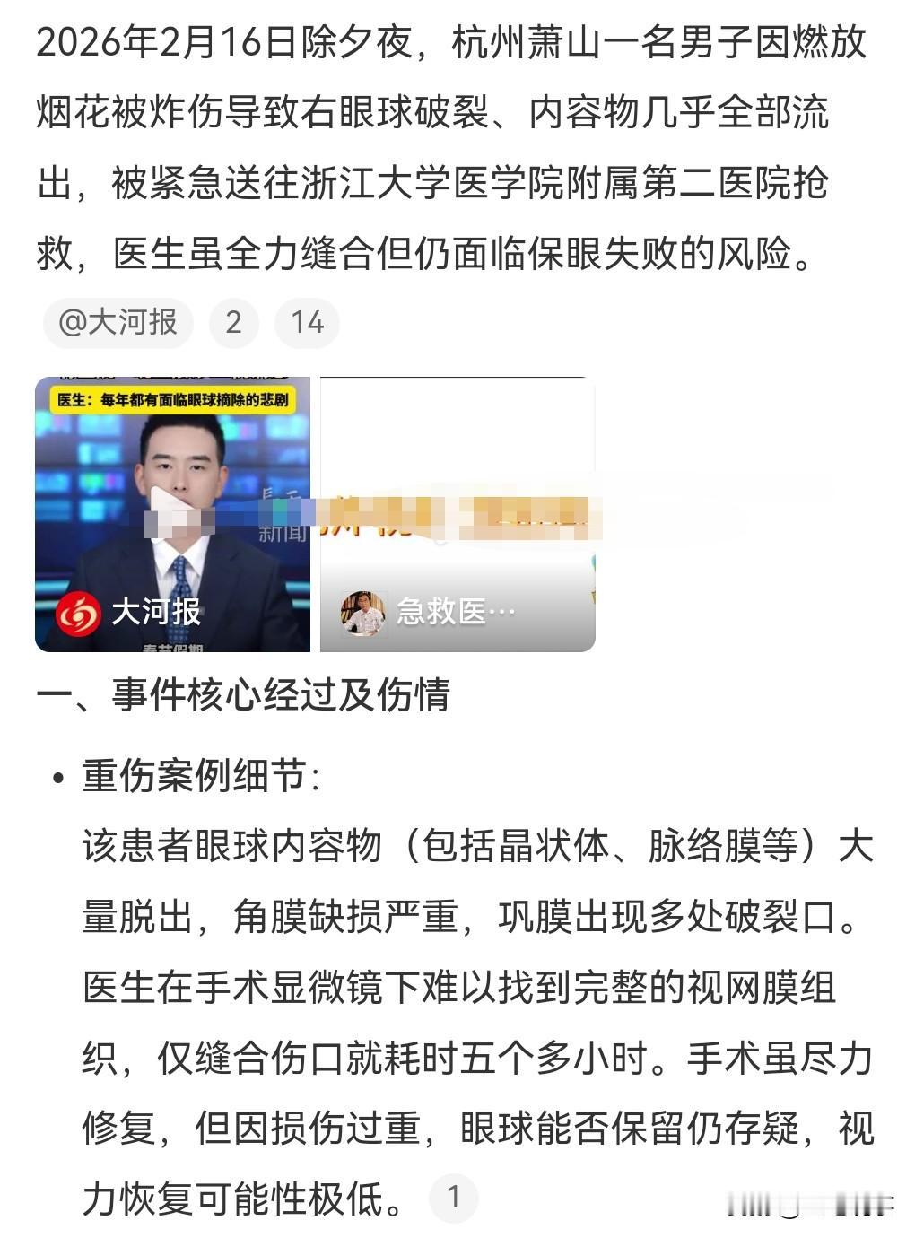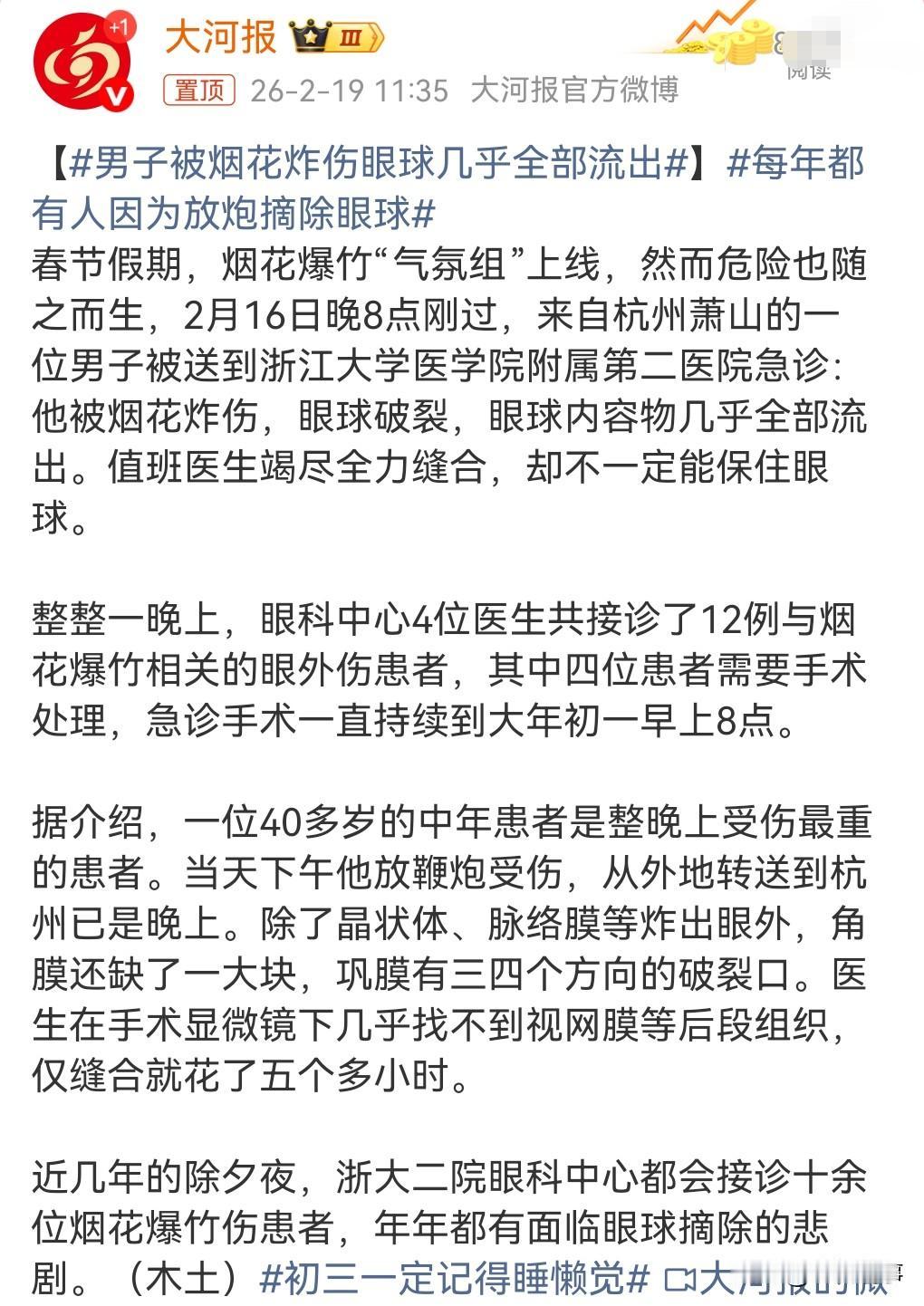 这真是太悲剧了,放烟花一定要格外小心,不要去看,要不然被炸伤就麻烦了。 2月16日,男子被烟花炸伤眼球几乎全部流出,每年都有面临眼球摘除的悲剧。 有时候还是少放吧,毕竟安全第一。 实不相瞒。 我有一个亲戚在多年前,突然烟花没响,他上前去看,结果突然一下嘣着他的眼睛了。 眼球不得不摘除。