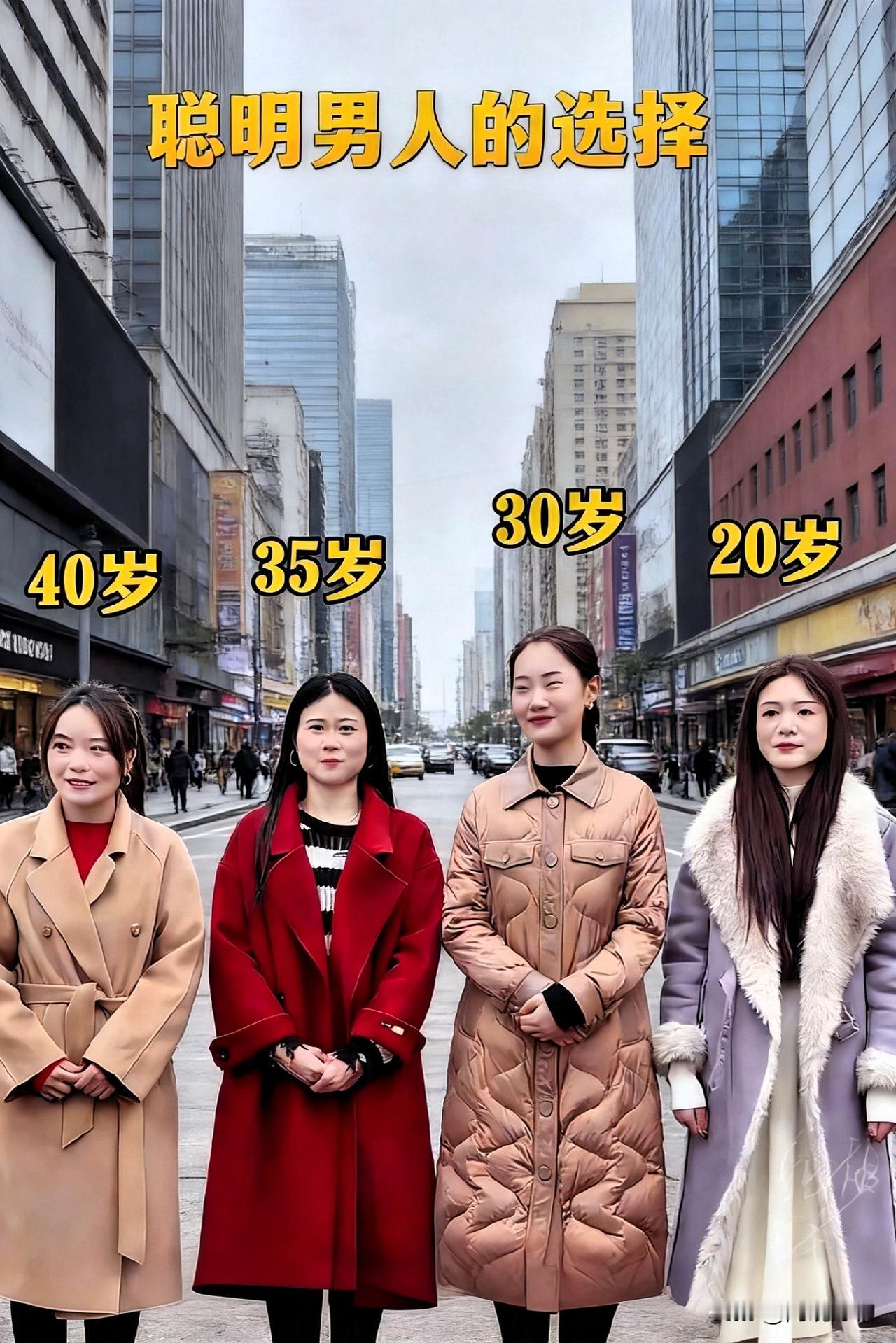 看完这张图我悟了!聪明男人的选择,原来藏着这些“潜规则”? 今天刷到一张神图,瞬间戳中无数人的心巴!图里四位不同年龄段的姐姐站在一起,从左到右分别标注着“40岁、35岁、30岁、20岁”,头顶的标题更是直白:“聪明男人的选择”。这不禁让人好奇:在感情的世界里,不同年龄段的女性到底藏着怎样的魅力?而所谓的“聪明选择”,又暗含着哪些现实的考量? 先看最左边的40岁姐姐,一身驼色大衣搭配红内搭,整个人散发着一种“岁月沉淀后的从容”。她的眼神里没有了年轻时的慌张,取而代之的是对生活的掌控感。这种成熟女性,往往更懂得经营关系,知道如何平衡家庭与自我,她们的“稳”,恰恰是很多男人在经历风雨后最渴望的港湾。 再看中间的35岁姐姐,红色大衣亮眼又不失大气,笑容里带着一丝温柔的坚定。这个年纪的女性,褪去了青涩,却还没被岁月磨平棱角。她们既有职场上的独立,又有生活中的细腻,就像一杯温热的茶,越品越有味道。很多男人会觉得,和这样的伴侣在一起,既能并肩奋斗,又能享受生活,是“进可攻退可守”的最佳拍档。 30岁的姐姐穿着驼色羽绒服,整个人显得温暖又踏实。这个年纪的女性,正处于人生的“黄金期”,有精力、有想法,对感情也更务实。她们不会过度依赖,也不会无理取闹,更多的是用行动去经营关系。对于男人来说,和这样的伴侣在一起,少了猜疑,多了默契,就像并肩作战的战友,互相扶持着往前走。 而最右边的20岁妹妹,浅紫色毛领大衣搭配白色连衣裙,满满的青春活力。她的笑容里透着一股未经世事的纯真,这种“新鲜感”和“活力”,对很多男人来说,本身就是一种无法抗拒的吸引力。就像春天里刚发芽的嫩叶,充满了生机,让人忍不住想要靠近。 其实,所谓的“聪明男人的选择”,从来都不是单一的。不同年龄段的女性,就像四季的风景,各有各的美。20岁的青春活力,30岁的踏实务实,35岁的温柔坚定,40岁的从容淡定,每一种都是独特的存在。聪明的男人,懂得欣赏不同阶段的美,而不是被年龄的标签所束缚。 那么问题来了,如果是你,你会选择哪一个年龄段的伴侣呢?是喜欢20岁的活力,还是更欣赏40岁的从容? 欢迎在评论区聊聊你的看法,让我们一起探讨感情里的那些事儿。 互动话题:你觉得哪个年龄段的女性最有魅力?为什么?评论区等你来聊美女人像群 高清美女