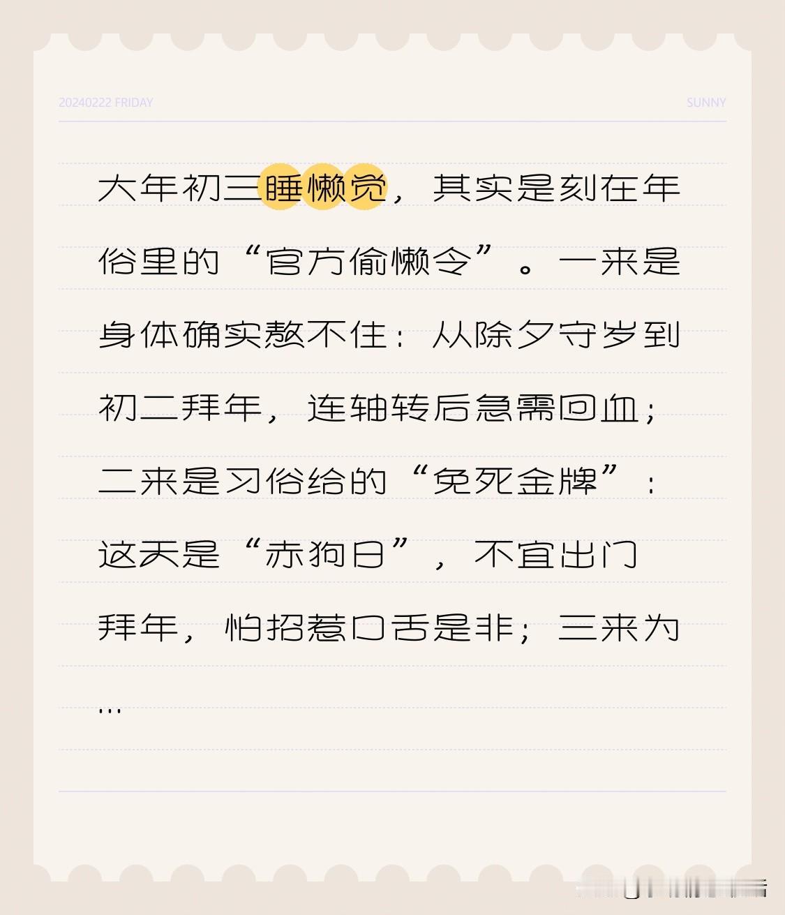 大年初三睡懒觉,其实是刻在年俗里的“官方偷懒令”。 一来是身体确实熬不住:从除夕守岁到初二拜年,连轴转后急需回血;二来是习俗给的“免死金牌”:这天是“赤狗日”,不宜出门拜年,怕招惹口舌是非;三来为了“让贤”给老鼠娶亲,早早熄灯睡觉,不打扰鼠辈办喜事。 老祖宗连“劳逸结合”都写进了年俗里,难怪初三成了春节最惬意的一天。 你还知道哪些关于“睡饱”的讲究?要不要我帮你整理一份兔年春节的“躺平指南”?大年初三几点起 寒假起床时间 赖床时间