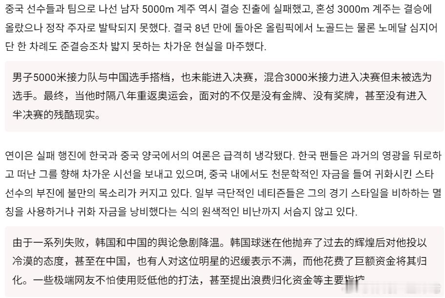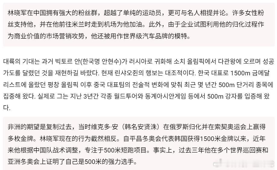 大概看了下,原文远远达不到嘲讽的地步,偏陈述林孝埈冬奥无冠的事实,归化无用论是在说“极端网友”,并且文中也提到过去三年林孝埈在其他世界大赛上所取得的成绩。