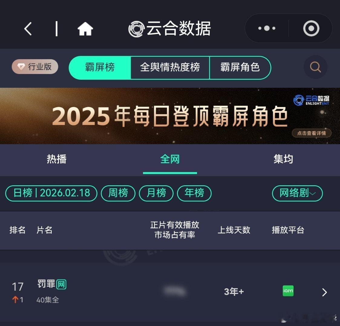 2月18日,罚罪2云合热播期结束第4天,上线第56天,全网第9!!!逆跌!!!黄景瑜罚罪2黄景瑜秦枫 罚罪,网络剧第17!!!逆跌!!。电视剧岁月有情时定档黄景瑜张小满 2月20日上线。