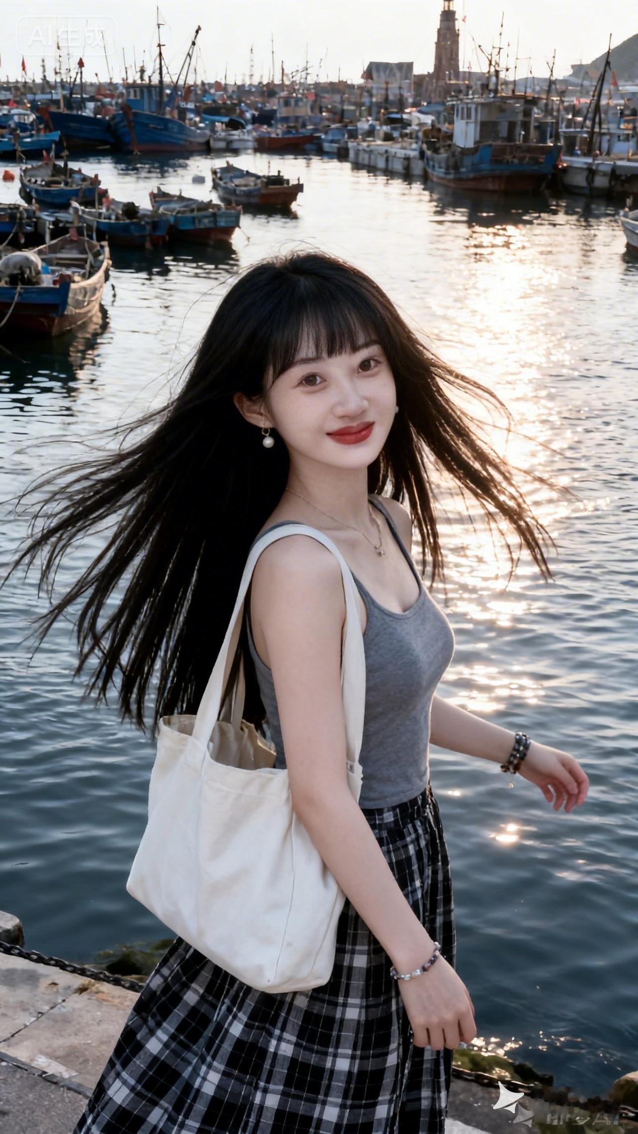 海边少女,阳光明媚,海风轻拂,快乐时光