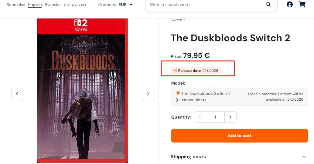 据外媒爆料,FS社Switch新作《黄昏血族》发售日疑似泄露,在澳洲的eshop中有了游戏页面,接着一个芬兰商店曝光了《黄昏血族》Switch 2游戏发售日为2026年3月27日,售价79.95欧元(约合651元人民币)。