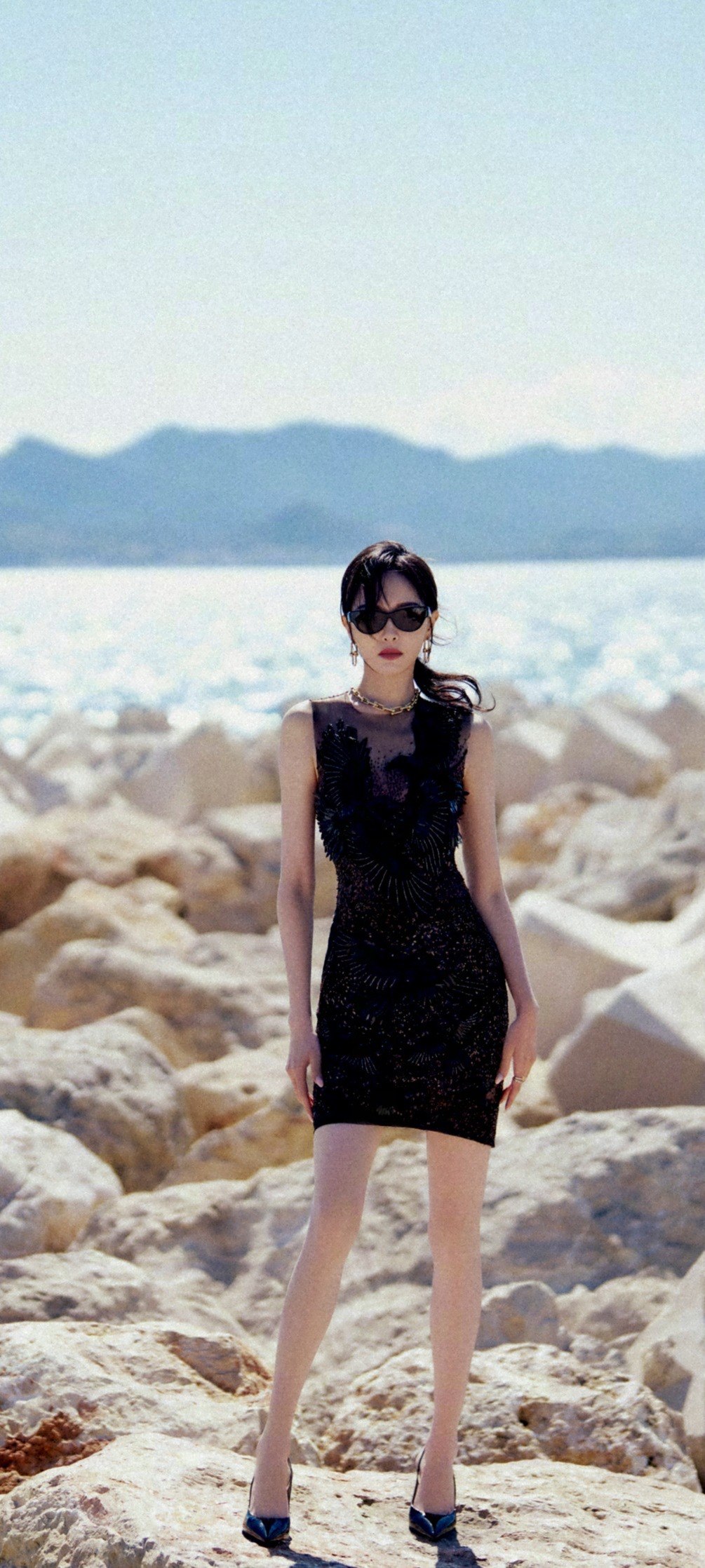 唐嫣手机全屏壁纸:黑色短裙大长腿穿搭写真。唐嫣