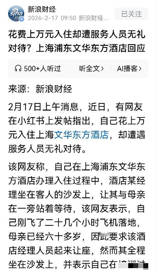 太离谱了!上海,大年初一,女子为了孝敬母亲,带老人入住上万元的上海顶奢酒店。因长途飞行母女俩疲惫不堪,在办理手续时,想让母亲坐下休息会,然而,酒店一名经理,占座顾客专属沙发,母女2人只能站立。女子要求其让座,不料,对方称,自己正在培训扮演客人,不能中断。女子指责对方太离谱,这么高档的酒店,怎能让客人站着?随后向酒店投诉。本以为,作为顶奢品牌酒店,对待顾客的意见会积极处理、致歉,可店方以及酒店总部的处理方式和态度,令人大跌眼镜! 说真的,这事儿听着就让人窝火,大年初一本来就是过年图个舒心,这女子一片孝心,花这么多钱,就是想让一辈子节俭、没怎么出过远门的母亲,能好好享受一次,结果刚到酒店就碰了一鼻子灰。 母女俩从境外转机过来,前前后后飞了二十多个小时,六十多岁的老人腿都肿了,走路都发飘,全程得靠女儿搀扶,换谁都想赶紧办完手续,找个地方坐下歇口气。 可偏偏就是这么简单的愿望,在这家上万元一晚的顶奢酒店里,却成了奢望。 休息区的沙发上,明明白白写着是给入住客人用的,结果却被一个挂着工牌的酒店经理占着,母女俩只能硬生生站在旁边,看着对方安安稳稳坐着。 按理说,工作人员看到客人这么疲惫,尤其是还有老人,就算自己有事,也该主动让个座,可这位经理倒好,被要求让座的时候,给出的理由简直让人无法理解,说自己正在带团队培训,扮演客人的角色,不能中断。 这话听着就离谱到家了,培训演客人,难道不是为了更好地服务真正的客人吗?现在真正的客人累得站不住,需要座位休息,反而要为工作人员的“演练”让路,让老人站着等,这哪是顶奢酒店该有的服务态度?说白了,就是摆不清自己的位置,把形式主义做到了极致,却忘了酒店最基本的宗旨是服务客人。 女子投诉之后,本来大家都以为,这么高端的品牌,肯定会第一时间道歉,积极处理问题,毕竟客人花了这么多钱,买的就是一份体面和舒心。 可没想到,酒店的操作一波比一波让人失望。当天倒是给女子升了套房,看着像是在补救,可这份补救,没过多久就变了味。 当天晚上,女子带母亲去餐厅吃饭,白天那个占座的经理又主动找了过来,絮絮叨叨说了一大堆关于“演练”的解释,全程没什么真诚的歉意,反而像是在辩解,意思就是自己没做错,是女子误会了。 这哪里是化解矛盾,分明就是来“讲道理”,把客人的不满当成了小题大做。 后来酒店又换了人出面,态度软了一些,说要补偿母女俩一顿午餐,女子也不想把好好的春节假期,都耗在这种争执上,就想着借坡下驴,这事就算了。 可谁知道,这补偿也是掺了水的,吃饭的时候工作人员才说,每人只有五百块的免单上限,多出来的部分得自己付。 要知道,这家酒店的午餐,单人团购都要八百八,双人套餐一千三百八,五百块连最普通的菜品都不够,这哪里是补偿,分明就是敷衍,甚至有点算计人的意思。 没办法,女子只能把投诉升到了酒店总部,把老人站着等座、经理占座、补偿设限不透明这些事,都写得明明白白。 总部倒是回得快,可内容全是模板化的客套话,只说抱歉,会核查流程,对于女子提出的关键问题,一个都没回应。 女子要求看大堂监控,核实当时的情况,可之后就没了下文,酒店也没人再主动联系她,问起监控的事,也只是口头说节日期间管理层休息,年后再沟通。 说句实在的,大年初一正是酒店客流最多、客人最需要服务的时候,管理层休息可以理解,但也不能把客人的问题抛在一边不管不顾。 花八千多块钱住一晚顶奢酒店,买的从来不是单纯的一个房间,而是一份安心、一份体面,是疲惫时能被善待的底气。 可这家酒店,昂贵的装修撑起了门面,却没撑起该有的服务和责任心,实在让人失望。 大家对此怎么看?欢迎评论区留下您的观点!