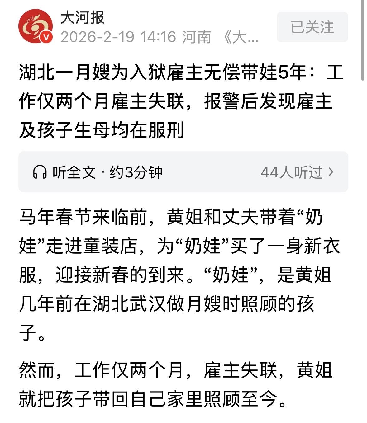 湖北武汉,女子当月嫂,一雇主把闺女交给她,让帮带2个月,并付了12000的工资。奇怪的是,雇主从不露面,两人只通过电话沟通,2个月一到,雇主彻底失联,他托朋友告诉女子,自己出事了,让她先带着,工资以后一起结清。女子只好孩子养在身边,一养就是5年,直到孩子要上幼儿园却没法落户口,雇主还不出现,女子和丈夫没招了,只好报警求助,这一查,让夫妻俩惊掉下巴。 临近春节,黄女士和老公高某某领着孩子去了趟商场,给孩子挑了一身大红色的新衣裳。 看着孩子穿着新衣服在镜子前比划,她心里那是五味杂陈,既高兴,又有点酸楚楚的。 这已经是孩子跟他们一起过的第5个年头了。然而,孩子并不是他们亲生的。 事情还得从2021年夏天说起。 那时候,黄女士和老公从老家跑到武汉讨生活,老公开网约车,她经老乡介绍接了个月嫂的活儿。 黄女士只知道雇主姓陈,她只和对方通过电话,从没见对方露过面。 雇主言简意赅,只在电话里嘱咐黄女士,好好照顾他那只有1岁多的闺女,并提前预支了她两个月工资,一共1万2。 黄女士拿到钱,说孩子交给我,你放心吧! 后来,她去了雇主老陈租的房子,家里奶粉、尿不湿堆得老高,都是雇主买的,可以看出他很爱女儿。 可她带娃带那么久,就是不见老陈的人影。 老陈把女儿的一切都交给她,偶尔打个电话问问,也是匆匆忙忙。 谁知道,2个月一到,这老陈就跟人间蒸发了一样,电话打不通,微信也不回。 直到房东上门催租,黄女士才慌了神。这老陈难道不要他这女儿了? 后来,有个自称老陈朋友的人给黄女士打来电话,说老陈出了点事,让她先帮衬着,钱以后算。 黄女士这人心软,想着孩子没人管不行,再说她还指望着以后结算工资呢。 这一等,就等到了过年,老陈还是没个人影,工资也没见着。 黄女士和老公一合计,总不能把孩子扔大街上吧?算了!带回老家接着带吧。 但她没想到,这一带就是5年。 这5年里,黄女士心里一直悬着块石头。她总想着,万一哪天老陈回来要接孩子走,她得把孩子完完整整、干干净净地交给人家。 所以她对这孩子,那是比对亲闺女还上心。 老公跑网约车辛苦,挣的钱也都贴补家用,给孩子买好的奶粉、上早教,夫妻俩从来没含糊过。 孩子不知道自己的身世,以为黄女士就是自己的亲生妈妈,黄女士每天听着孩子“妈妈妈妈”地叫,就觉得啥都值了。 到了2023年,孩子要上幼儿园了,这户口成了大问题。没户口,连幼儿园的门都进不去。 黄女士和老公实在没辙了,去派出所报了警,想找找孩子的亲爹。 这一查,查出来的结果让夫妻俩震惊了。 老陈不是不要闺女了,而是因为犯事,进去了,还得蹲十几年。 后来,老陈从里面寄来一封信,字写得歪歪扭扭,但话语真诚。 他在信里写到:虽然咱们没见过,但我知道您是好人。我闺女跟着您,我放心,您就是她在世上最亲的人了。 看着信,黄女士心里稍微踏实了点,想着既然亲爹在,哪怕在监狱,也能给孩子落个户吧? 可命运这东西,真会捉弄人。 DNA一比对,老陈跟这孩子压根就没血缘关系!这下好了,孩子还是个黑户。 警察同志顺着疫苗本上的名字去找孩子的亲妈,结果更让人心里堵得慌。孩子亲妈竟然也在监狱里服刑。 也有人劝她,说把孩子送福利院吧,你们家条件也不好,还有自己的生活,别拖累了。 说实话,黄女士也犹豫过。这几年为了养这孩子,家里确实紧巴。 但每次看到孩子抱着我的脖子撒娇,喊妈妈,她就狠不下那个心。 5年啊,就是块石头也捂热了。把孩子送走,那就是在自己心口上割一刀,她也得疼死。 今年过年,黄女士还是给孩子买了新衣服,还是给她包了压岁钱。老公说,不管以后咋样,今年这年得过好。 他还说,过完年带孩子回乡下走亲戚,让七大姑八大姨都看看,这是家里的一份子。 黄女士看着孩子穿着新衣服在屋里跑来跑去,心里默默做了个决定:只要我和老公还有一口饭吃,就不能让这孩子受委屈。 哪怕她亲爹亲妈以后出来了,要把孩子带走,那是后话。现在,她就是我的娃,这就是命里的缘分。 这个案子,核心就在于解决孩子在亲生父母均服刑且无血缘关系的情况下,由谁来行使监护权的问题。 《民法典》第27条规定:父母是未成年子女的监护人。未成年人的父母已经死亡或者父母没有监护能力的,由下列有监护能力的人按顺序担任监护人:其他愿意担任监护人的个人或者组织,但是须经未成年人住所地的居民委员会、村民委员会或者民政部门同意。 黄姐夫妇虽与孩子无血缘关系,但已实际抚养长达5年,形成了稳定的生活照料和情感依赖,符合“最有利于被监护人”的法律原则。 黄姐作为“愿意担任监护人的个人”,在经过街道办、民政部门或居委会的评估同意后,可以合法担任孩子的监护人。 对此,你怎么看? 关注@运良说法 学法律知识不迷路
