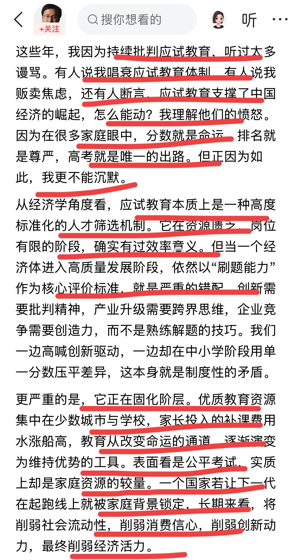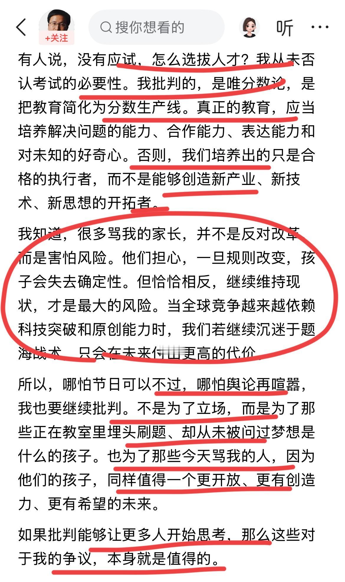 著名经济学家宋清辉再谈应试教育!! 他立下重誓,年可以不过,应试教育他要坚地一直批判下去,为的是,要拯救骂他的人的孩子!!宋老师自从他的大儿子因为不堪小升初后的学习压力,选择了极端,一个清晨,永远离开了!!从此,宋清辉每天至少发一篇文章纪念爱子,四年了,发了一千多篇文章,他表示,只要太还有力气,就会一直发下去,他觉得,儿子能感受到!! 儿子出事后,宋老师一边纪念一边痛批应试教育的危害,他认为教育制度害了他儿子,如果不是压力巨大,不会出事! 他儿子文化课成绩一般,但酷爱画画,也很有天赋,到小学已经画了一千幅的作品,非常厉害!儿子离开后,宋清辉称,他保留了儿子的一切,衣物,画作,毛发,甚至是他儿子的一瓶尿液~ 他希望能够感应到什么吧~ 最后,他还是不能走出来,悲痛欲绝唯有每天发文纪念!他把所有问题,归结和指向应试教育,他认为只有素质教育,快乐教育才能有未来,才能培养有创造性的人才~ 你认同宋老师的观点吗,有何看法呢?