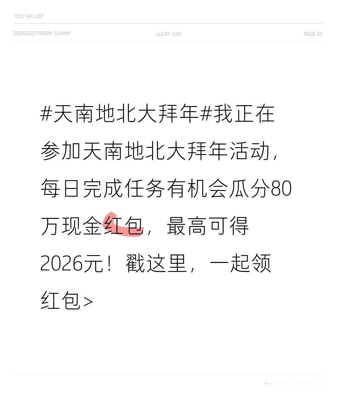我正在参加天南地北大拜年活动,每日完成任务就有机会瓜分80万现金红包,最高能拿2026元,这谁能不心动啊! 这个活动从2026年2月11日12:00持续到3月15日23:59。主会场“骏马启程”分50万,按奔跑里程瓜分,跑得越多分的越多。每天免费跑10km,完成发微头条、实拍图笔记、拍视频特效等任务,还能加速。像发微头条能加速30km,有机会瓜分1500元。另外还有集卡点灯活动分20万。这么好的机会,赶紧戳链接一起领红包!