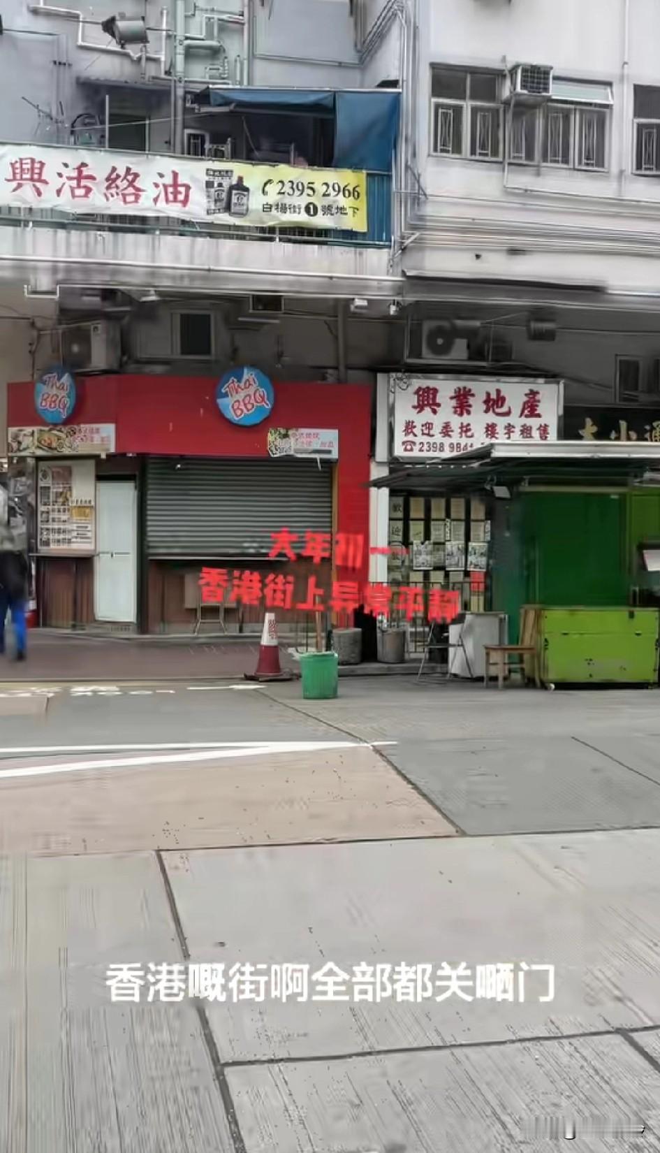大年初一香港街上冷冷清清,一个人都没有店铺全部关门,异常平静!都回大陆了吗? 以前看电视里香港过年非常热闹,都在逛街,我们这边是窝在家里。当时挺羡慕,现在一样了。卸下霓虹灯那一刻,就知道香港已经是回不去当初的繁华了! 香港的店铺大部分初三初四才会营业,不过确实和以前不同了。再也没有了那么多的影视作品、没有了四大天王、没有了歌圣、没有了繁华、没有了大家心中的向往。