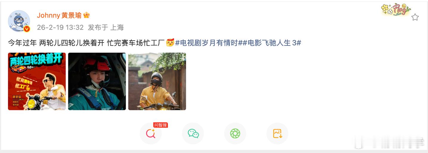 黄景瑜打工赛车两不误 这个春节,黄景瑜用两轮和四轮给观众带来了双重惊喜!《岁月有情时》里他骑着摩托穿梭在工厂,把平凡的生活演绎得精彩纷呈;《飞驰人生3》里他开着赛车在赛道上飞驰,又让观众感受到了梦想的力量,太赞了!
