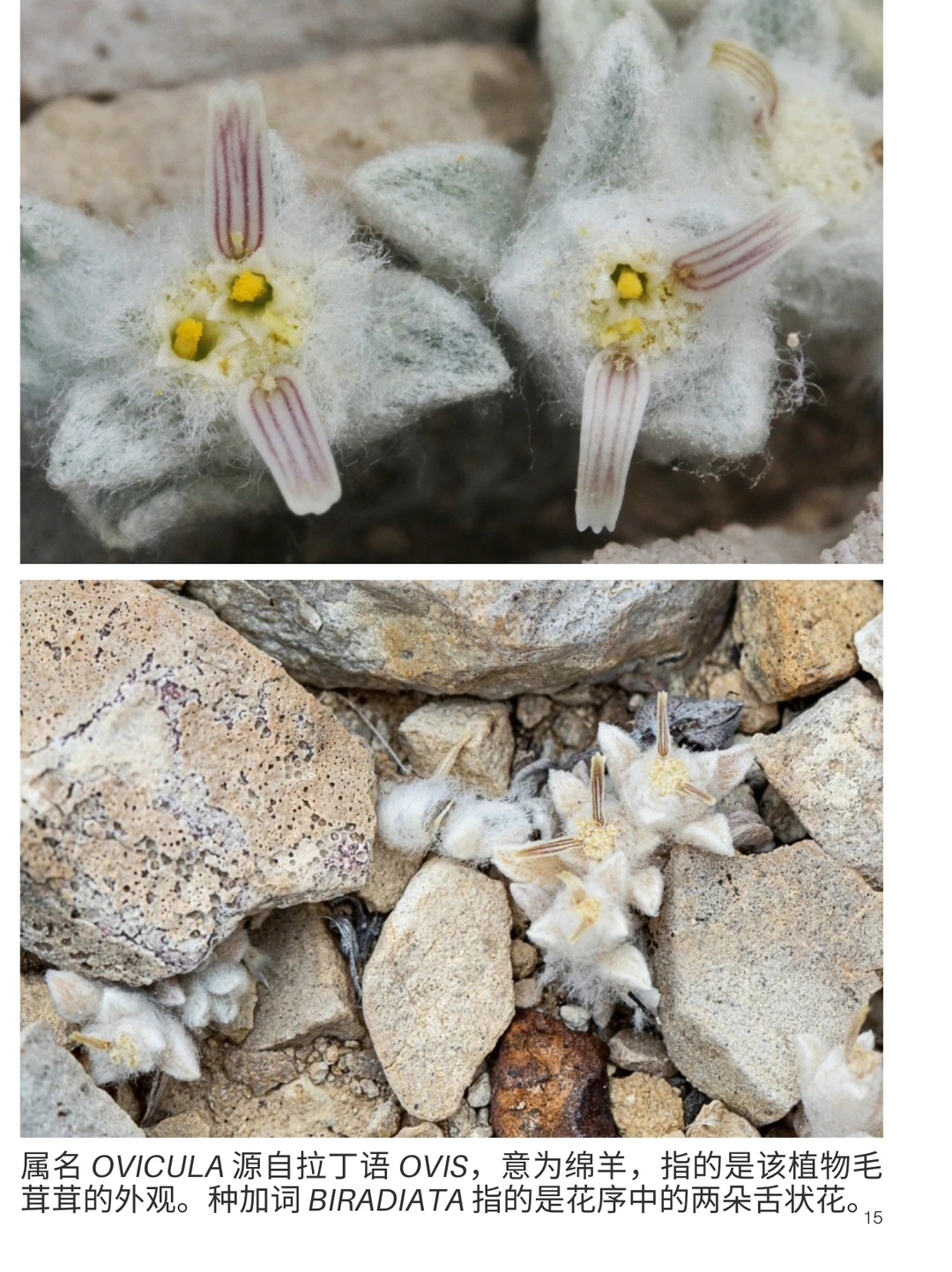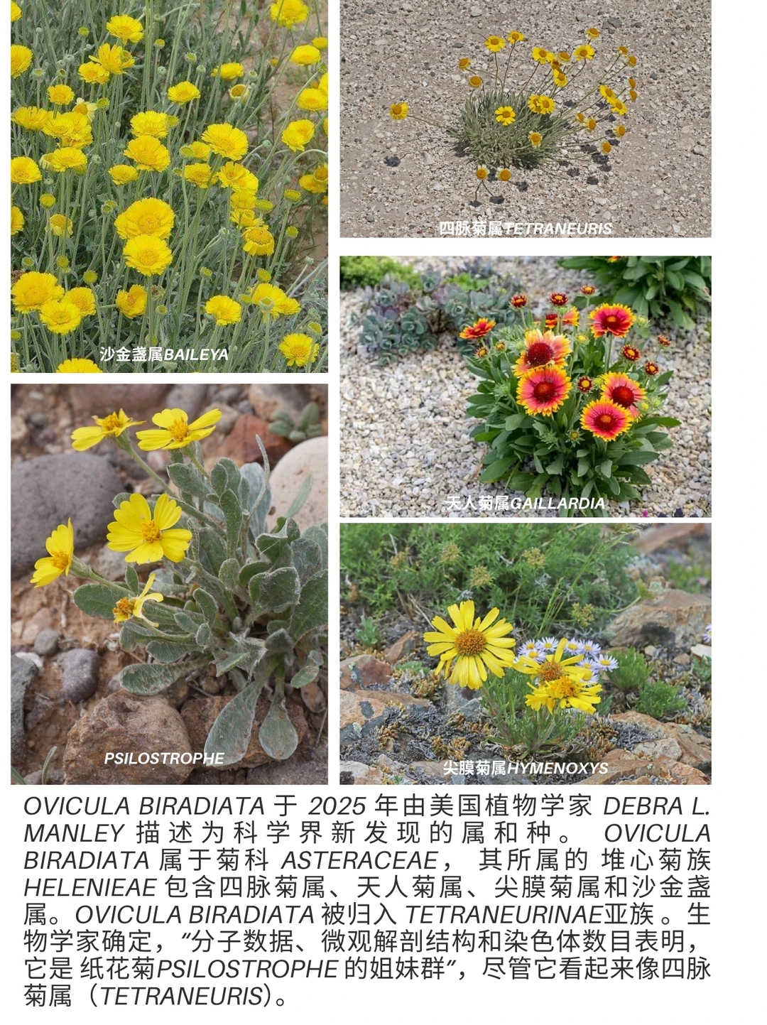 Ovicula biradiata 于 2025 年由美国植物学家 Debra L. Manley 描述为科学界新发现的属和种。 Ovicula biradiata 属于菊科 Asteraceae, 其所属的 堆心菊族Helenieae 包含四脉菊属Tetraneuris、天人菊属Gaillardia、尖膜菊属Hymenoxys和沙金盏属Baileya。Ovicula biradiata 被归入 Tetraneurinae亚族 。生物学家确定,“分子数据、微观解剖结构和染色体数目表明,它是 纸花菊Psilostrophe 的姐妹群”,尽管它看起来像四脉菊属(Tetraneuris)。菊科 Ovicula属 Ovicula biradiata