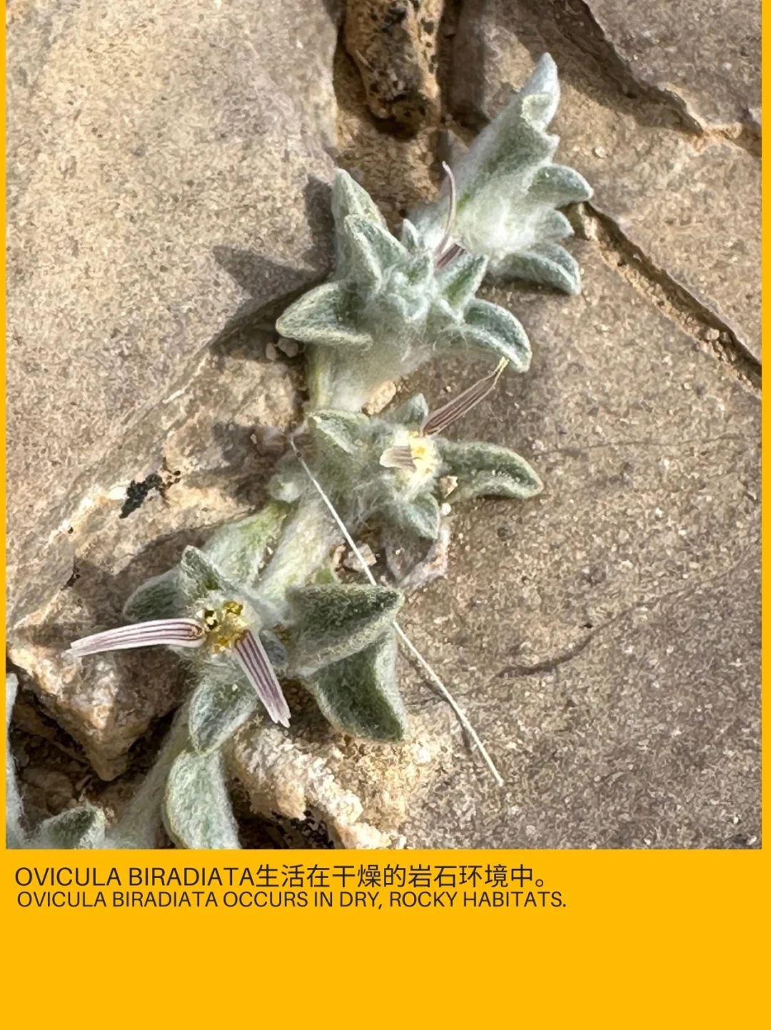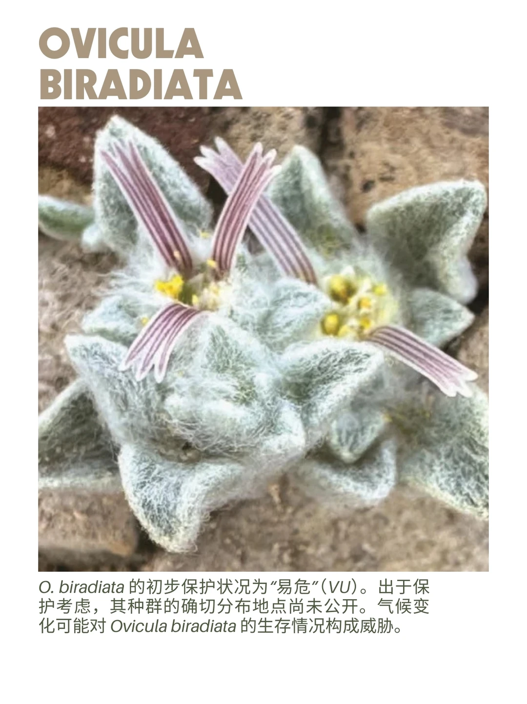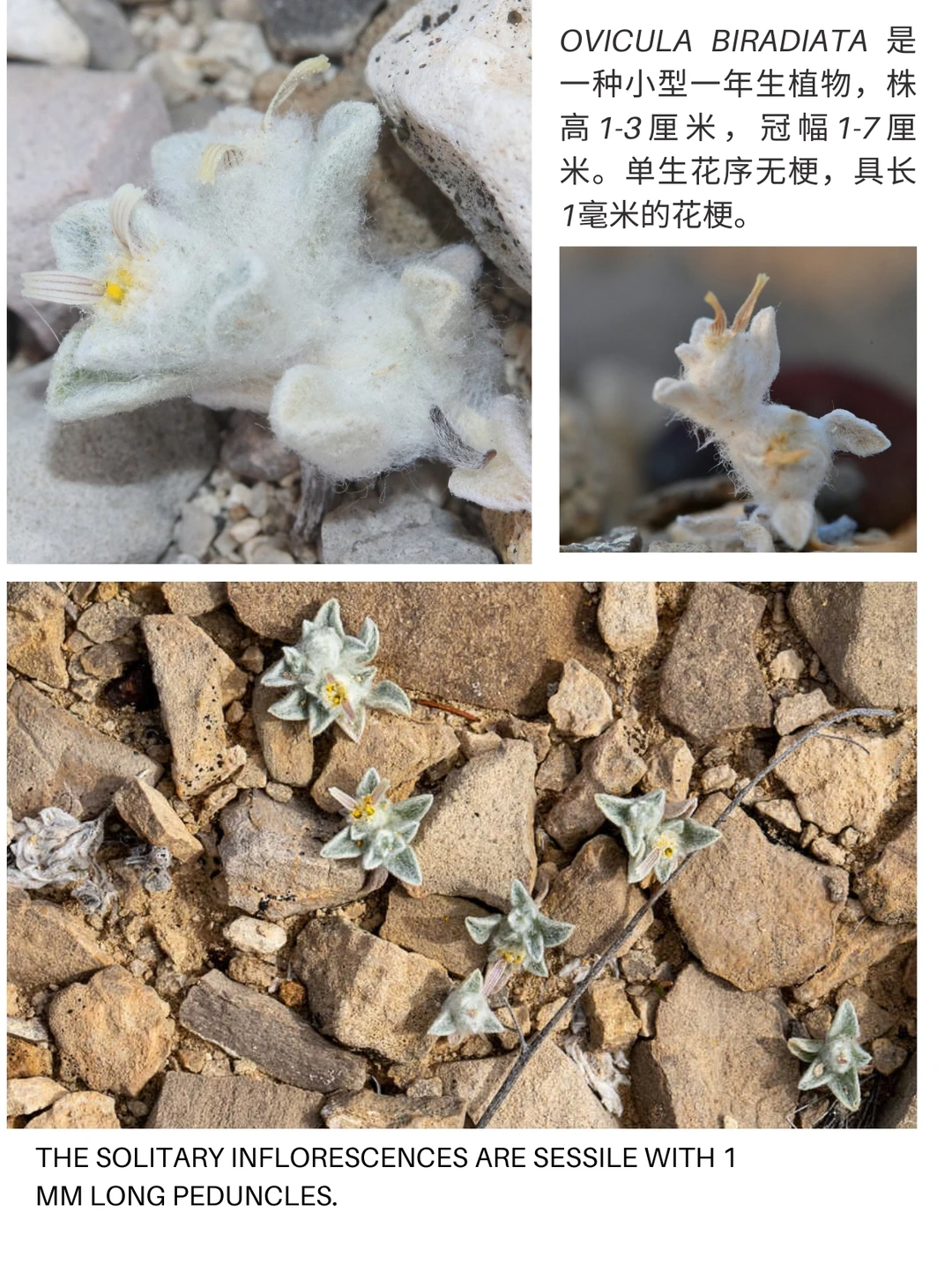 Ovicula biradiata 是一种小型一年生植物,株高1-3厘米,冠幅1-7厘米。单生花序无梗,具长1毫米的花梗。