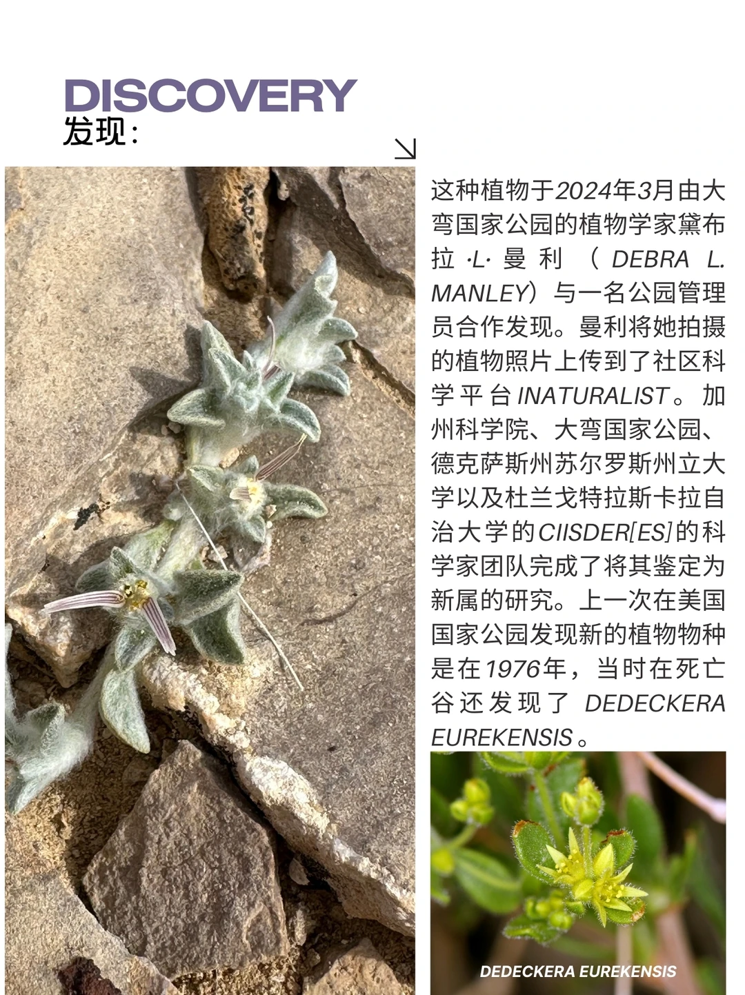 这种植物于2024年3月由大弯国家公园的植物学家黛布拉·L·曼利(Debra L. Manley)与一名公园管理员合作发现。曼利将她拍摄的植物照片上传到了社区科学平台iNaturalist。加州科学院、大弯国家公园、德克萨斯州苏尔罗斯州立大学以及杜兰戈特拉斯卡拉自治大学的CIISDER[es]的科学家团队完成了将其鉴定为新属的研究。上一次在美国国家公园发现新的植物物种是在1976年,当时在死亡谷还发现了 Dedeckera eurekensis 。