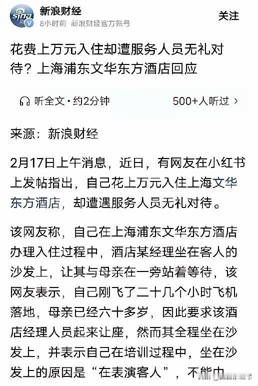 “必须严惩!”上海,女子坐了20几个小时飞机,带着60多岁老母亲,花了上万元入住豪华酒店,办理入住时,酒店经理坐在沙发上,女子让他让座,经理却说:我在培训“表演客人”不能中断,女子火冒三丈,向酒店投诉,得到升级套房,没想到这只是刚开始! 花上万元入住豪华酒店,本是为了让长途奔波的母亲安心休息,上海这位女子的遭遇却让网友纷纷喊话必须严惩。 2026年大年初一,女子带着60多岁的母亲,历经20多个小时的跨洋长途飞行抵达上海,长时间的旅途让母女二人身心俱疲,老人更是腿脚酸软、精神倦怠。 为了给母亲一份舒适体面的春节体验,女子特意花费上万元,预订了当地一家高端豪华酒店,满心期待能开启一段轻松惬意的休憩时光。 两人拖着沉重的行李箱走进酒店大堂,准备办理入住手续,大堂内专供宾客休息的沙发上,坐着一名身着正装的酒店经理,全程没有起身迎接,也没有任何服务示意。 女子看着身旁疲惫不堪的母亲,不忍心让老人一直站着等候,便上前示意希望对方能暂时让出座位,让老人稍作歇息。 这名经理始终稳坐不动,以自己正在参与内部培训、扮演客人的流程不能中断为由,直接拒绝了女子的合理请求,没有丝毫变通与歉意。 长途飞行的劳累、对母亲的心疼,叠加酒店方的冷漠傲慢,让女子瞬间怒火中烧,当场向酒店提出正式投诉,要求对方给出合理解释与处理。 酒店方面为平息事态,快速提出将预订房间免费升级为套房的补偿方案,女子以为此事能就此告一段落,没想到这只是一连串糟心经历的开端。 升级房间后,酒店并未针对经理的不当行为做出诚恳道歉,后续的餐饮礼遇、服务响应也处处设置限制,全程敷衍了事。 此前拒绝让座的经理,还在女子用餐时段主动上前争执,反复强调培训流程的合理性,完全没有反思自身失职,进一步激化了双方矛盾。 女子提交书面投诉后,收到的回复也是模板化的套话,没有实质整改与真诚致歉,甚至回避调取监控核实情况。 这场满怀孝心的春节出行,最终变成了一场耗时耗力的维权闹剧,女子的经历被分享到网络后,迅速引爆全网热议。 大量网友对女子的遭遇表示同情,怒斥酒店方价格与服务严重不匹配,花高价购买的不是奢华享受,而是委屈与轻视。 有网友直言,高端酒店的核心价值从来不是装修与房价,而是对宾客的基本尊重,经理占用宾客座位、漠视老人需求,完全违背服务行业底线。 也有网友认为,酒店的补偿只是表面功夫,没有真诚道歉的处理方式,只会让消费者更加心寒。还有网友分享自身高端消费踩坑经历,感慨不少品牌只重营销不重服务,把流程看得比人更重要。 一小部分网友觉得女子过于较真,认为升级套房已是合理补偿,不必过度追究,但更多网友坚持,消费权益与人格尊重无关价格高低,任何行业都不能用内部规则漠视顾客的合理需求。 一场本该温暖的孝心之旅,被酒店的傲慢与敷衍彻底打乱,也让大众看到高端服务背后不容忽视的缺失。 对此,你们有什么看法,欢迎评论留言~