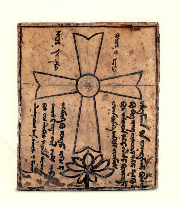 内蒙古博物院藏赤峰市松山区乡城子村出土元代 景教瓷墓志。十字架上部的古叙利亚纹为“看见你,想着你”。下部则是古回鹘文“从亚历山大汗算起1564(年),(从)中国(纪年)算起于牛年正月二十(日),术安库木哥将军71岁时,以上天的旨意,将这宫室和围墙完成。在这建筑的地方,立起与天永久的石碑”