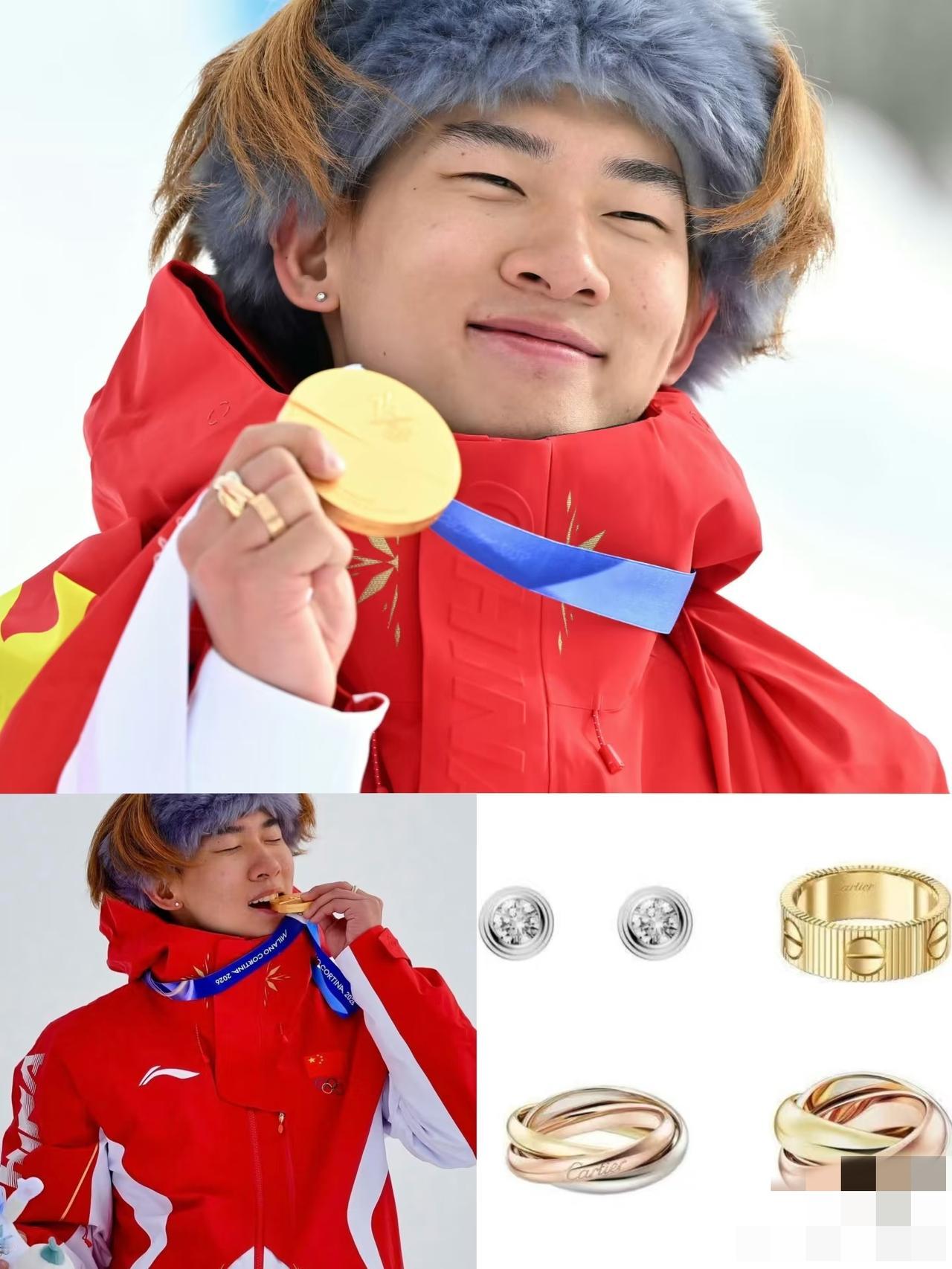 苏翊鸣真豪气,金牌领奖时把能戴的都戴上了,浑身珠光宝气! 2月18日,苏诩鸣站在米兰冬奥会的决赛场,以82.41分的成绩获得单板滑雪男子坡面障碍技巧决赛中的冠军,也是我国体育代表团本届冬奥会中的首枚金牌。 当成绩出来时,苏翊鸣站在台上忍不住哭了,眼睛里泛着泪花,这块金牌对他来说意义重大,更是对他平时刻苦训练的肯定。 苏翊鸣比赛时打扮是朴素的,基本上没戴什么首饰,关键戴首饰也怕影响成绩,而他是非常时尚的,平时就喜欢戴首饰。 果然,等夺得金牌领奖时,苏翊鸣迫不及待戴了好多首饰,把能戴的全部都戴上了,好亮眼。 只见他一只手上戴了两个戒指,有一款戒指是三个戒指叠在一起的,看着好多,还有耳钉、名表,两只手上都戴着戒指,最起码有四五个。 这些戒指有的是银质的,有的是金黄色的,看着非常亮眼,更是让苏翊鸣珠光宝气。 2月18日刚好也是苏翊鸣22岁的生日,他还是00后,喜欢追逐时尚,也有了女朋友,戴这些首饰是兴趣爱好,刚好也彰显了他的气质。 没想到的是,他一口气戴了那么多首饰,有一点点炫耀的意思,当然了,与他的年龄有关系,毕竟还很年轻,是00后嘛,怎么打扮都可以,只要自己喜欢就行。 不得不说,苏翊鸣果然豪气,领个奖戴这么多首饰,非常有商业前途。