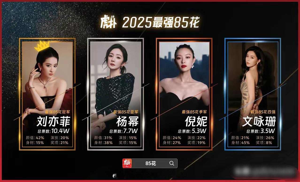 虎扑2025最强85花评选排行榜,杨幂不敌刘亦菲,倪妮、文咏珊比赵丽颖排名靠前。