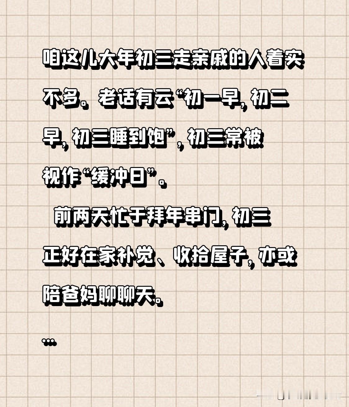 咱这儿大年初三走亲戚的人着实不多。老话有云“初一早,初二早,初三睡到饱”,初三常被视作“缓冲日”。 前两天忙于拜年串门,初三正好在家补觉、收拾屋子,亦或陪爸妈聊聊天。 但也有例外,像新婚小夫妻或许初三回娘家,有些地方也有特定习俗需在这天走动。 你们那儿初三走亲戚吗?有啥特别讲究?来评论区聊聊,让我也涨涨见识~