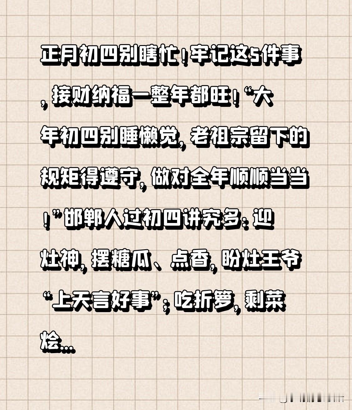 正月初四别瞎忙!牢记这5件事,接财纳福一整年都旺! “大年初四别睡懒觉,老祖宗留下的规矩得遵守,做对全年顺顺当当!” 邯郸人过初四讲究多: 迎灶神,摆糖瓜、点香,盼灶王爷“上天言好事”; 吃折箩,剩菜烩一锅,寓意“聚福不浪费”; 捏饺子边,包紧实,封口舌是非; 扔穷,清垃圾、通风,赶跑晦气; 接五路财神,傍晚亮灯摆酒,盼八方来财! “你家初四有啥老讲究?评论区聊聊~” 觉得有用点赞✅ 收藏⭐️ 转发家人,一起过足年味! 正月初四的讲究 初四来财 初四接财神 春节初四习俗 初四习俗 初四民间习俗