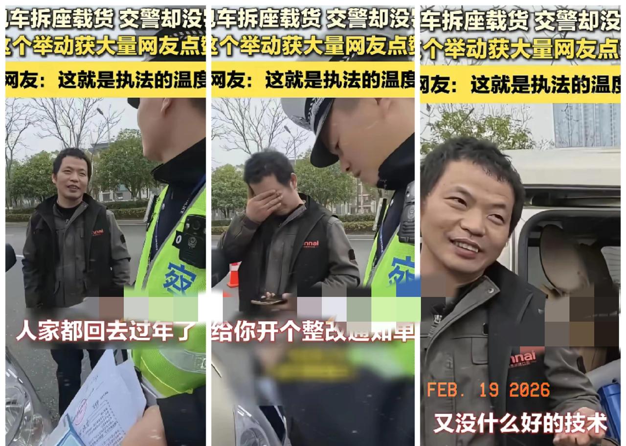 “感动!”春节期间交警查车,遇到一辆为了多拉货拆掉座椅的面包车,车主下车后满脸堆笑,试探性的问交警能不能少罚点,交警没有搭话,准备开具罚单,随口问了一句:“过年怎么还在拉货?” 司机道出难处,上有患癌老父亲,下有三个孩子要养,没技术只能趁春节多跑几趟挣点钱。交警听后放下罚单,只开整改通知书,还贴心为他泡了一碗热面。 法律有尺度,更有温度。坚守规则底线,又体谅底层不易,这才是最动人的执法。不冷漠、不苛刻,一碗面暖了胃,一句话暖了心。 这样有温度的执法,你是不是也被狠狠戳中了? 温暖执法