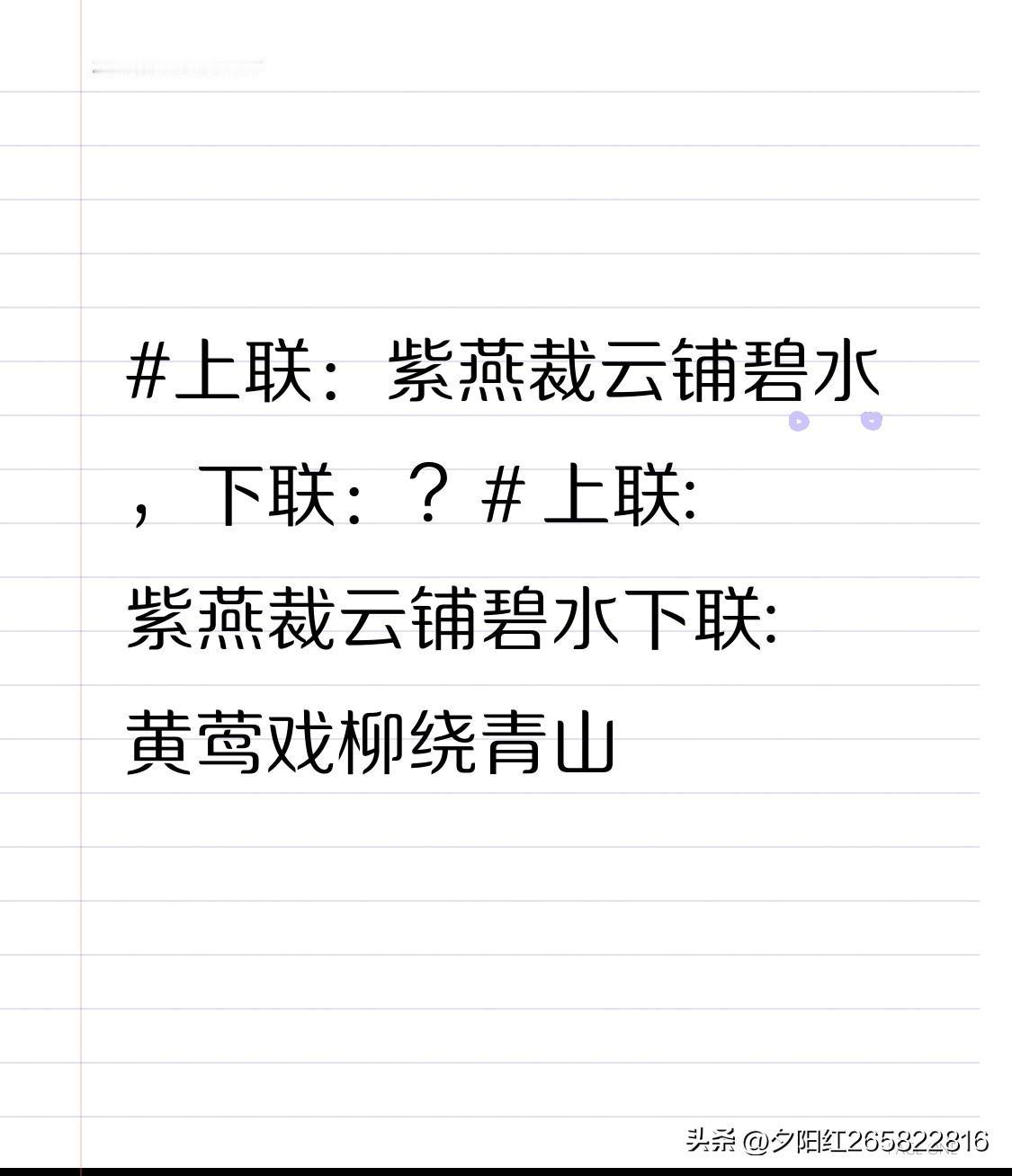 上联:紫燕裁云铺碧水 下联:黄莺戏柳绕青山