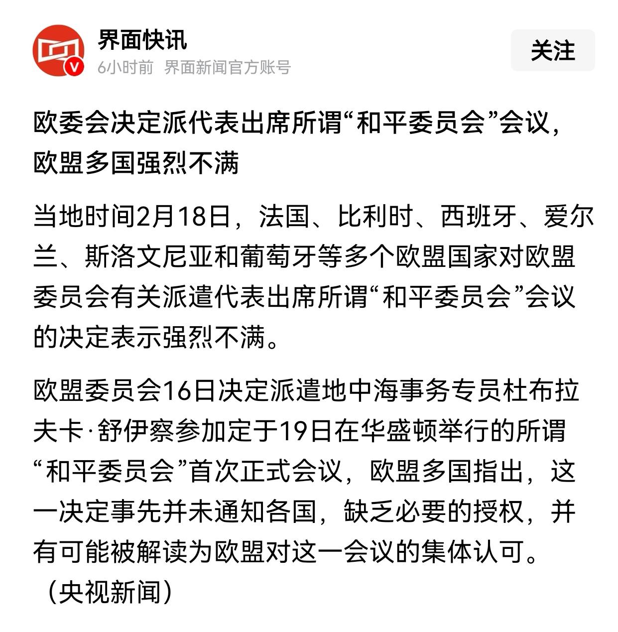 欧盟委员会日前决定派地中海事务专员杜布拉夫卡、舒伊察参加定于今天(2月19日)在华盛顿举行的所谓“和平委员会”首次正式会议,但引发法国、比利时、爱尔兰、西班牙、葡萄牙等多个欧盟国家的强烈不满,认为欧委会的决定没有得到相应授权。 尽管卡拉斯口无遮拦,冯德莱恩称其为“孤独者”、“独裁者”,但涉及到欧盟的外交政策,冯德莱恩无权做出任何决定。正常的程序应是卡拉斯向欧盟理事会主席请示汇报甚至召开理事会,才能做出是否派代表出席的决定,尔后由卡拉斯负责宣布。现在的情况是不仅暴露了冯德莱恩和卡拉斯根本尿不到一个壶里,欧委会的决定确属越俎代庖。