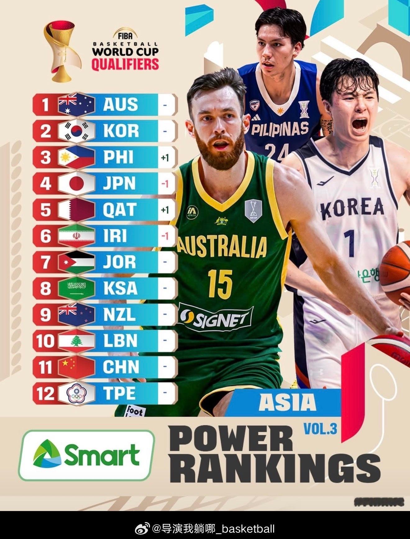 FIBA国际篮联公布了世预赛亚洲区第二个窗口期的实力榜单:澳大利亚排在第1,中国男篮排在第11名