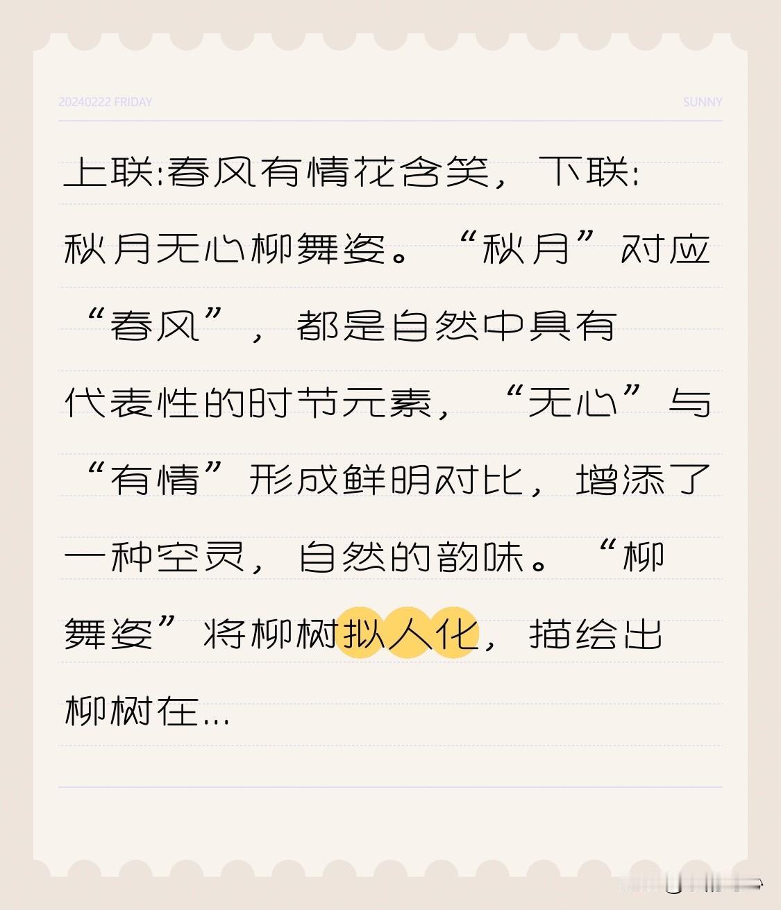 上联:春风有情花含笑, 下联:秋月无心柳舞姿。 “秋月”对应“春风”,都是自然中具有代表性的时节元素,“无心”与“有情”形成鲜明对比,增添了一种空灵,自然的韵味。“柳舞姿”将柳树拟人化,描绘出柳树在秋风中摇曳的姿态,和“花含笑”中花朵绽放的神情相呼应,共同营造出清新自然的画面。