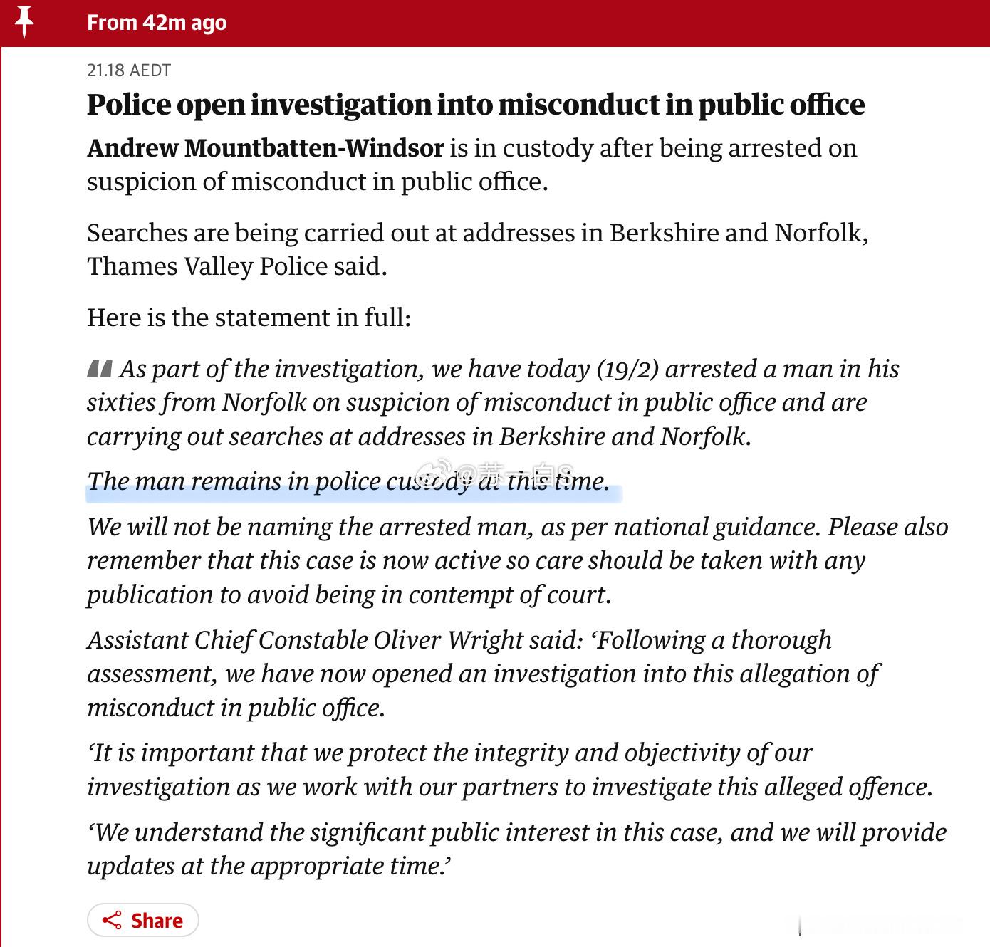 安德鲁从温莎皇家庄园被赶出去后,住进了位于诺福克郡的桑德林汉姆庄园(图二),英国当地时间今早上午10点多,警方突袭了这里(图三),之后公布声明(图四)表示逮捕了一位六十多岁的男子,他涉嫌在公职中行为不当,且警方还在伯克郡和诺福克郡的多个住所进行搜查。