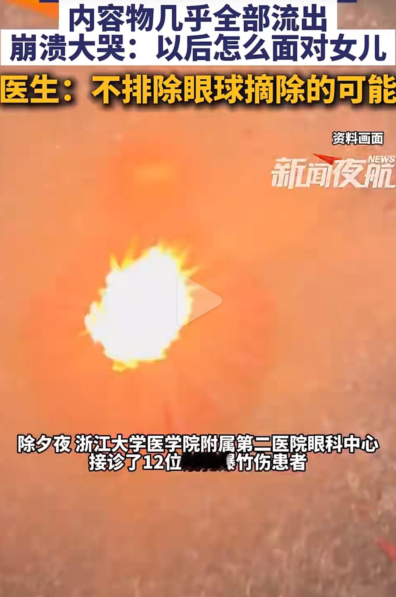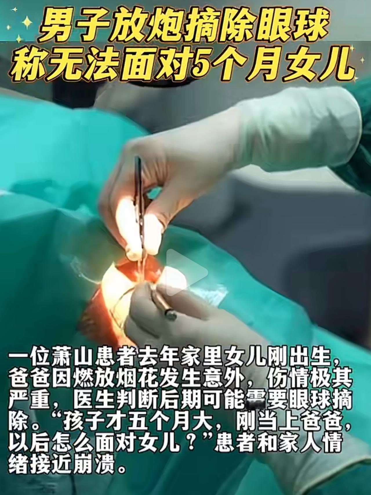 大年三十本该是全家团圆的日子,可对杭州这位男子来说,却成了一辈子都忘不掉的噩梦。 他四十多岁,家里还有个才5个月大的小女儿,就因为放了个烟花,右眼当场被炸穿,眼球里的东西几乎全都流了出来,光是听着就让人浑身发麻。 医生在显微镜下整整抢救了5个小时,能缝的都尽力缝上了,可视网膜碎得一塌糊涂,就算眼球勉强保住,这只眼睛大概率也彻底看不见了。 更让人心里发慌的是,这不是个例。 就在同一个除夕夜,这家医院一口气收了12个被烟花炸伤眼睛的病人,4个需要紧急做手术,有人直接摘除了眼球,还有老人被炸得满脸都是碎片,看着太揪心。 很多人都觉得,离远一点就安全了,可现实真不是这样。 十米开外照样能被流弹打中,低头看一眼没响的哑炮,眼睛可能就直接废了。 每次看到这种新闻,心里都又难受又可惜。 年味真的不用拿命去换,一时大意,换来的可能就是一辈子的遗憾。 放烟花可千万别大意,离远一点,哑炮碰都别碰,老人小孩一定要看管好。 人健健康康、平平安安,比啥年味儿都重要。春节安全 烟花爆竹 烟花炸伤