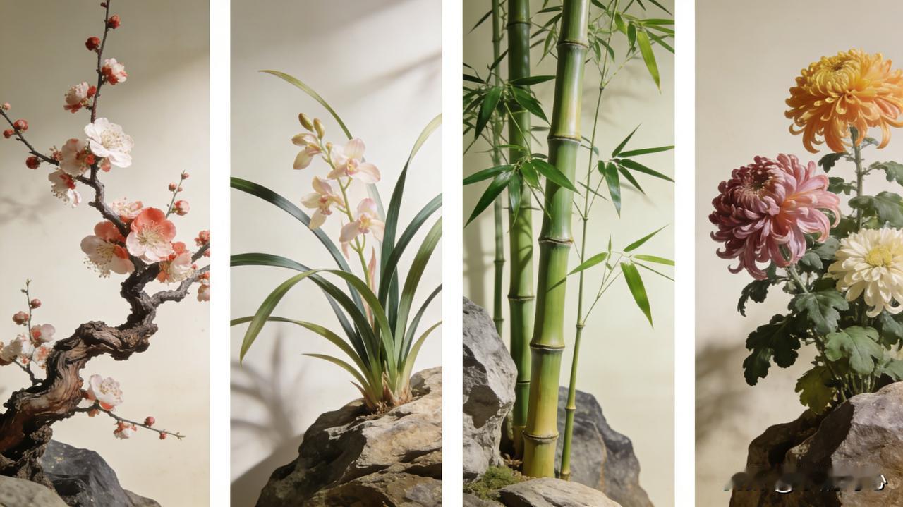 上联:风霜雨雪四时景, 下联:梅兰竹菊四君风。 “梅兰竹菊”被称为花中四君子,代表着高洁、坚韧、正直等美好品质,和“风霜雨雪”的自然元素相呼应。“四君风”表示四君子所蕴含的风骨和精神,富有文化内涵,展现出一种典雅的气质。