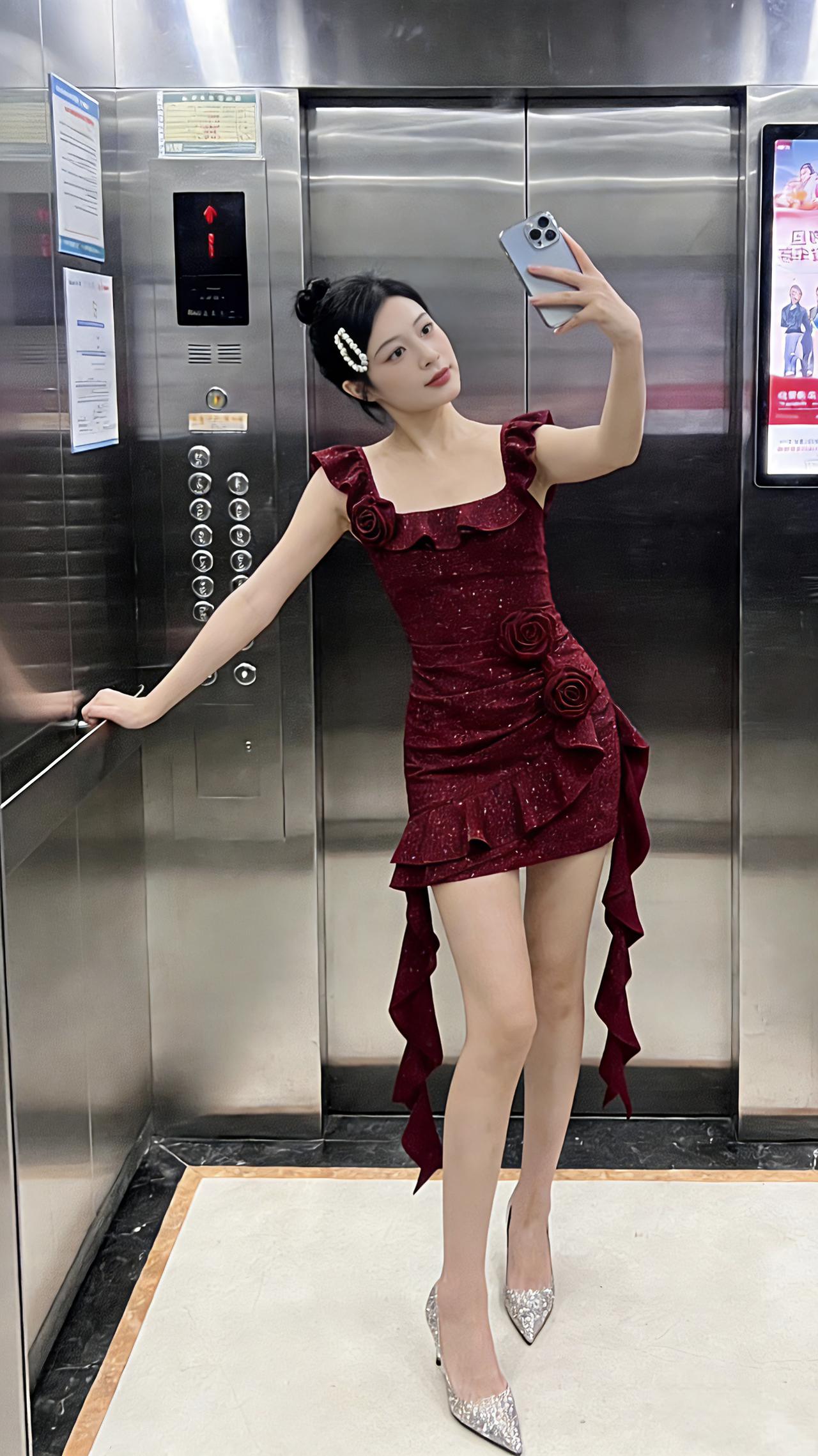 新年快乐 新年时髦穿搭 新年红红火火大吉大利 电梯拍照